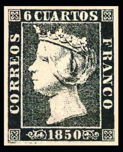 | Keywords: The first postage stamp of Spain.jpg en The first postage stamp of Spain 6 cuartos; black 1850 es Primer sello de España 6 cuartos negro 1850 ru Пе вая почтовая ма ка Испании 6 куа тосов; чё ная 1850 г Propio De mi disco duro Pedro Ayala 1850 stamp ; 2008-09 scan PD-old 1850 stamps of Spain Isabella II of Spain on stamps 1850 Black stamps Tiaras diadems on stamps |