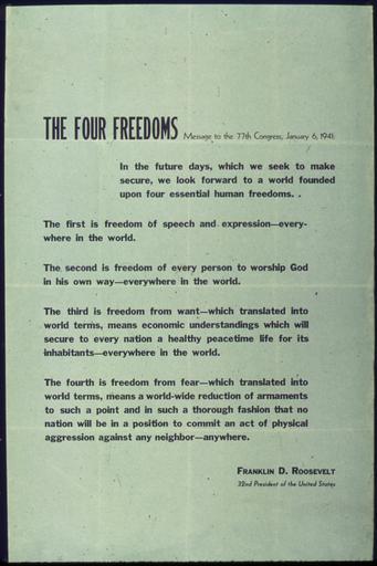 | Keywords: THE FOUR FREEDOMS - MESSAGE TO THE 77TH CONGRESS - NARA - 515602.jpg Scope and content General notes 515602 Local identifier 44-PA-1919 Office for Emergency Management Office of War Information Domestic Operations Branch Bureau of Special Services 03/09/1943 - 09/15/1945 Still Picture Records Section Special Media Archives Services Division NWCS-S National Archives at College Park 8601 Adelphi Road College Park MD 20740-6001 1941 - 1945 Record group Record Group 44 Records of the Office of Government Reports 1932 - 1947 Record group ARC 373 World War II Posters compiled 1942 - 1945 Series ARC 513498 File unit File unit ARC Variant control numbers NAIL Control Number NWDNS-44-PA-1919 Other versions <gallery> File THE_FOUR_FREEDOMS_-_MESSAGE_TO_THE_77TH_CONGRESS_-_NARA_-_515602 tif tif File THE_FOUR_FREEDOMS_-_MESSAGE_TO_THE_77TH_CONGRESS_-_NARA_-_515602 jpg jpg </gallery> NARA-cooperation PD-USGov World War II posters from the United States |