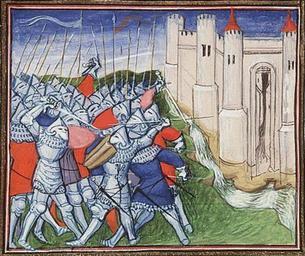 | Keywords: The French defeated before Calais by Edward III.jpg en Jean Froissart Chroniques Vol I The French defeated before Calais by Edward III Place of origin date Paris Virgil Master illuminator ; c 1410 Material Vellum ff 382 385x288 243x187 mm 42 lines littera cursiva Binding 18th-century brown leather; gilt; with coat of arms of Stadholder William V Decoration 1 two-column miniature 170x180 mm ; 29 column miniatures 115/65x95/80 mm ; 1 historiated initial 45x50 mm ; decorated initials with border decoration ff 1r 24r 36r 62r 74v etc Provenance Louis de Luxemburg conn š table de France d 1475; signature erased ; by descent to his granddaughter Françoise de Luxembourg and her husband Philip of Cleves d 1528; coat of arms with label over erasure; signature ; purchased in 1531 from Philip ™s estate by HenriIII Count of Nassau d 1538 ; by descent to the Princes of Orange-Nassau the later Stadholders at The Hague; carried off in 1795 to Paris by the French and restituted to the Koninklijke Bibliotheek in 1816 http //www kb nl/manuscripts/show/manuscript/72+A+25 Jean Froissart Chroniques Vol I Virgil Master illuminator ca 1410 Edward III of England Chroniques de Froissart vol 1 - Den Haag KB 72 A 25 c 1410 Medieval miniatures of battles Bataille de Calais PD-old-100 |