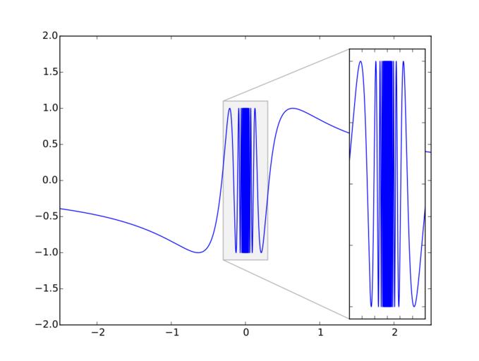 Keywords: The function sin(1 over x).svg en The function <math>f x \R\to\R x\mapsto \begin cases \sin\left \tfrac 1x\right x \neq 0 \\ 0 x 0 \end cases </math> 2016-04-23 own http //kulla me Stephan Kulla User Stephan Kulla other versions <gallery> The function sin 1 over x svg Graph of function sin 1 over x The function x sin 1 over x svg Graph of function x sin 1 over x The function x 2 sin 1 over x svg Graph of function x 2 sin 1 over x </gallery> Other fields Matplotlib + import matplotlib pyplot as plt import numpy as np from mpl_toolkits axes_grid1 inset_locator import zoomed_inset_axes mark_inset xs1 np linspace -3 3 10001 xs2 1/ np arange 1 1001 1 np pi/2 xs np union1d np union1d xs1 xs2 -xs2 ys np sin 1/xs f ax plt subplots ax plot xs ys ax set_xlim -2 5 2 5 ax set_ylim -2 2 axins zoomed_inset_axes ax 1 7 loc 4 axins plot xs ys axins set_xlim -0 3 0 3 axins set_ylim -1 1 1 1 mark_inset ax axins loc1 3 loc2 2 fc 0 95 ec 0 7 plt xticks visible False plt yticks visible False plt savefig The function sin 1 over x svg cc-zero Continuity functions Trigonometric functions |