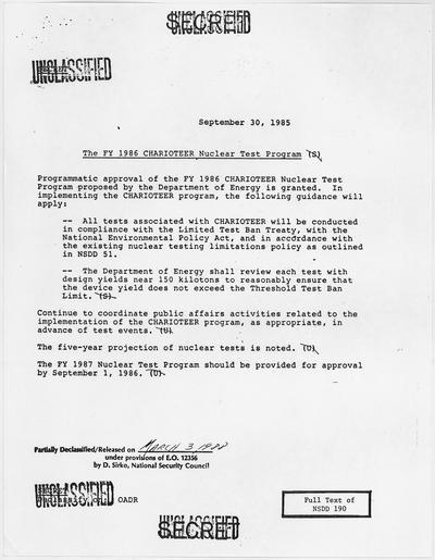 | Keywords: The FY 1986 CHARIOTEER Nuclear Test Program - NARA - 198307.tif Scope and content General notes 198307 Local identifier President 1981-1989 Reagan National Security Council 1981 - 1989 Ronald Reagan Library NLRR 40 Presidential Drive Simi Valley CA 93065-0600 1985-09-30 Record group Collection RR-NSC Numbered National Security Policy Papers 1981 - 1989 Record group ARC 1189 National Security Decision Directives compiled 02/25/1981 - 01/19/1989 Series ARC 198166 File unit File unit ARC Variant control numbers NAIL Control Number NLS-NSC-NSDD-190 yes Other versions <gallery> File The_FY_1986_CHARIOTEER_Nuclear_Test_Program_-_NARA_-_198307 tif tif File The_FY_1986_CHARIOTEER_Nuclear_Test_Program_-_NARA_-_198307 jpg jpg </gallery> NARA-cooperation PD-USGov Operation Charioteer Presidential Decision Directives Reagan NARA TIF images with categorized JPGs |