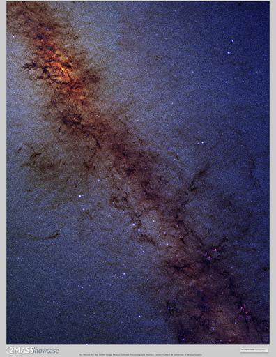 | Keywords: The Galactic Center.jpg en The center of our Milky Way Galaxy is located in the constellation of Sagittarius In visible light the lion's share of stars are hidden behind thick clouds of dust This obscuring dust becomes increasingly transparent at infrared wavelengths This 2MASS image covering a field roughly 10 x 8 degrees about the area of your fist held out at arm's length reveals multitudes of otherwise hidden stars penetrating all the way to the central star cluster of the Galaxy This central core seen in the upper left portion of the image is about 25 000 light years away and is thought to harbor a supermassive black hole The reddening of the stars here and along the Galactic Plane is due to scattering by the dust; it is the same process by which the sun appears to redden as it sets The densest fields of dust still show up in this mosaic Also evident are several nebulae to the lower right including the Cat's Paw Nebula The 2MASS analysis software has identified and measured the properties of almost 10 million stars in this spectacular field alone 2003-04-13 http //www ipac caltech edu/2mass/gallery/showcase/galcen/index html 2MASS/G Kopan R Hurt http //www ipac caltech edu/2mass/gallery/showcase/copyright html -- Atlas Image or Atlas Image mosaic obtained as part of the Two Micron All Sky Survey 2MASS a joint project of the University of Massachusetts and the Infrared Processing and Analysis Center/California Institute of Technology funded by the National Aeronautics and Space Administration and the National Science Foundation thumb 100px left No frame version http //www ipac caltech edu/2mass/gallery/showcase/copyright html 2MASS/G Kopan R Hurt Uploaded with UploadWizard 2MASS images Galactic Center |