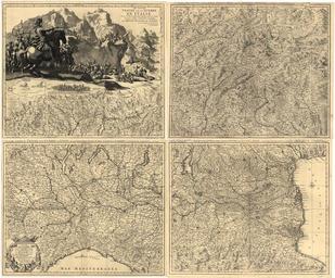 | Keywords: The Grand Theater of the War in Italy WDL413.png Artwork ru о тье Пье 1663-1736 fr Mortier Pierre 1663-1736 en Mortier Pierre 1663-1736 zh 莫迪埃 皮埃尔 1663-1736 pt Mortier Pierre 1663-1736 ar مورتيير بيير 1663-1736 es Mortier Pierre 1663-1736 ru Большой теат военных действий в Италии fr Le grand théâtre de la guerre en Italie en The Grand Theater of the War in Italy zh 意大利大战 pt O Grande Palco da Guerra na Itália ar مسرح الأحداث الكبير للحرب في إيطاليا ru Пье о тье 1661-1711 был голландским издателем атласов ка т и схем о тье был внуком елигиозных беженцев покинувших Ф анцию и поселившихся в Лейдене около 1625 года Он вы ос в Амсте даме кото ый в то в емя был цент ом междуна одной книжной то говли В юношеском воз асте он п овел несколько лет в Па иже где познакомился с ф анцузскими ка тами и издателями Ве нувшись в Амсте дам около 1685 года он за екомендовал себя как издатель ка т высокого качества в том числе еп интов абот Алексиса-Юбе а Жайо иколаса Сансона и д угих великих ф анцузских ка тог афов Эту ка ту подче кнуто военной нап авленности о тье составил для п инца Евгения Савойского 1663-1736 главнокомандующего войсками Священной Римской импе ии в войне за испанское наследство 1701-14 Эта война была сопе ничеством за ев опейское влияние в езультате кото ого Ф анция Людовика XIV оказалась нат авленной на коалицию включавшую Англию Голландию и Священную Римскую импе ию Пе вые этапы войны азве нулись в севе ной Италии В аботу о тье включены четы е ка ты на кото ых изоб ажены азные зоны конфликта В ве хнем левом углу ка ты азмещены я кие г авю ы Евгения азво ачивающего военные опе ации в Альпах а также г авю а пленения ма шала Ф ансуа де ефвиль де Вилле ой в ночь с 31 янва я на 1 фев аля 1702 года Ка та в п авом ве хнем углу доходит до Ге мании Бава ии и Авст ии <br>Священная Римская импе ия; Военные ка ты; Война за испанское наследство 1701-1714 гг fr Pierre Mortier 1661-1711 était un éditeur néerlandais d'atlas ainsi que de cartes terrestres et marines Petit-fils de réfugiés religieux de France qui se sont installés à Leiden aux environs de 1625 Mortier grandit à Amsterdam qui était à l'époque le centre du commerce international de l'édition En tant que jeune homme il passa plusieurs années à Paris où il découvrit les cartes et les éditeurs français De retour à Amsterdam vers 1685 il s'établit comme éditeur de cartes de haute qualité comprenant des rééditions des œuvres d'Alexis-Hubert Jaillot de Nicolas Sanson et d'autres grands cartographes français Mortier a produit ce plan d'attaque militaire pour le Prince Eugène de Savoie 1663-1736 principal commandant des forces du Saint Empire romain germanique dans la guerre de Succession d'Espagne 1701-14 La guerre était une lutte pour la dominance de l'Europe elle oposait la France de Louis XIV contre une coalition comprenant l'Angleterre la Hollande et le Saint Empire Romain germanique Une grande partie des premiers combats ont eu lieu au nord de l'Italie L'oeuvre de Mortier comprend quatre cartes indiquant les différentes zones de conflit La carte en haut à gauche contient des gravures picturales d'Eugène conduisant des opérations militaires dans les Alpes et la capture du Maréchal François de Neufville de Villeroy dans la nuit du 31 Janvier 1702 au 1er Février 1702 La carte en haut à droite s'étend à l'Allemagne Bavière et à l'Autriche <br>Saint Empire romain; Cartes militaires; Succession d'Espagne Guerre de 1701-1714 en Pierre Mortier 1661-1711 was a Dutch publisher of atlases maps and charts The grandson of religious refugees from France who settled in Leiden about 1625 Mortier grew up in Amsterdam which at the time was the center of the international book trade As a young man he spent several years in Paris where he got to know French maps and publishers Returning to Amsterdam about 1685 he established himself as a publisher of high quality maps including reprints of works by Alexis-Hubert Jaillot Nicolas Sanson and the other great French mapmakers Mortier produced this striking military map for Prince Eugene of Savoy 1663-1736 the principal commander of the forces of the Holy Roman Empire in the War of the Spanish Succession 1701-14 The war was a contest for European dominance that pitted the France of Louis XIV against a coalition that included England Holland and the Holy Roman Empire Much of the early fighting took place in northern Italy Mortier s work includes four maps showing different areas of conflict The map at the upper left contains vivid engravings of Eugene conducting military operations in the Alps and of his capture of Marshall François de Neufville de Villeroy on the night of January 31-February 1 1702 The map at the upper right extends into Germany Bavaria and Austria <br>Holy Roman Empire; 