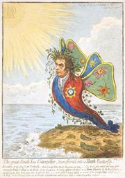 Keywords: The great south sea caterpillar, transform'd into a Bath butterfly.jpg This is an image of a 1795 cartoon entitled The great south sea caterpillar transform'd into a Bath butterfly Cartoon shows the metamorphosis of Sir Joseph Banks from a caterpillar to a butterfly upon his investiture with the Order of the Bath as a result of his South Sea expedition Draped with the ribbon and wearing the jewel of Bath he rises chrysalis shaped from the mudflats on butterfly wings emblazoned with sea creatures towards a radiant sun enclosing a crown MEDIUM 1 print etching hand-colored CREATED/PUBLISHED London Pubd by H Humphrey 1795 July 4th Library of Congress Prints Photographs Division LC-USZC4-8780 color film copy transparency http //memory loc gov/master/pnp/cph/3g00000/3g08000/3g08700/3g08780u tif archival TIFF version 49 MB rotated cropped and converted to JPEG with the GIMP 2 4 6 image quality 88 1795-07-04 creator James Gillray No known restriction on publication LOC-image cph 3g08780 PD-old-100 James Gillray Caricatures of the United Kingdom |