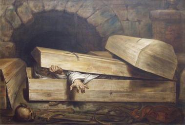 Keywords: The Hasty Burial.jpg Artwork Creator Antoine Wiertz Elsietett temetés The Premature Burial L'inhumation précipitée Il sepolto vivo 1854 oil on canvas cm 160 235 Musée Wiertz Brussels place of discovery object history exhibition history credit line MORT DU CHOLERA / Certifié par nous Docteurs / Sandoutes text center fr accession number 1968 place of creation Photographer Colour of ether on http //www flickr com/photos/37785354 N00/2059392045 Flickr August 7 2007 Precipitate Burial jpg https //www fine-arts-museum be/fr/la-collection/antoine-wiertz-linhumation-precipitee Q18221510 cropped and dimensions stretched Jappalang PD-old-auto-1923 1865 L'Inhumation précipitée by Antoine Wiertz |