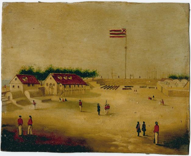 Keywords: 'The Hawaiian Flag on Honolulu Fort' by Paul Emmert, 1853.jpg The Hawaiian Flag on Honolulu Fort by Paul Emmert 1853 oil on paper board 8 x 10 inches Frazier Fine Art 1853 Creator Paul Emmert <gallery>File 'View of the Honolulu Fort - Interior' oil on canvas painting by Paul Emmert c 1853 Hawaii Historical Society jpg</gallery> Paul Emmert History of Hawaii Flags in art Honolulu Fort Flags of Hawaii Oil on paper PD-old-100 |