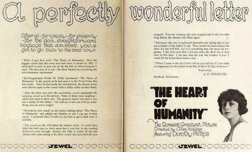 Keywords: The Heart of Humanity (1918) - Ad.jpg The Heart of Humanity 1918 with Dorothy Phillips pages 726 and 727 of the July 19 1919 Motion Picture News 1919-07-19 https //archive org/details/motionpicturenew201unse Motion Picture News Jul-Aug 1919 at the Internet Archive Universal Film Manufacturing Company PD-USGov DEFAULTSORT Heart of Humanity The Uploaded with UploadWizard Dorothy Phillips The Heart of Humanity Motion Picture News |