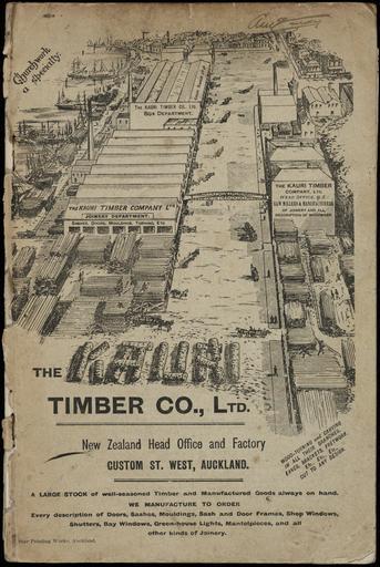 | Keywords: text document writing monochrome drawing sketch Shows a bird's-eye view of the company's premises at Custom Street West, Auckland, with the Joinery and Box Departments at the left, and the head office at the right. The two sections are joined by an overhead walkway. The far left shows sailing ships tied up at the wharves. In the foreground are neat piles of sawn timber, and in the wide corridor between the buildings, horses and carts move with their loads of timber. Quantity: 1 b&w photo-mechanical print(s) on cover of catalogue.. Physical Description: Offset print, on cover 284 x 186 mm. The Kauri Timber Company Ltd (Auckland Office) :[Catalogue. Front cover. ca 1906].. The Kauri Timber Company Ltd (Auckland Office) :[Catalogue. ca 1906].. Ref: Eph-B-BUILDING-SUPPLIES-CA-1906-01-front. Alexander Turnbull Library, Wellington, New Zealand. natlib.govt.nz/records/23202176 Shows a bird's-eye view of the company's premises at Custom Street West, Auckland, with the Joinery and Box Departments at the left, and the head office at the right. The two sections are joined by an overhead walkway. The far left shows sailing ships tied up at the wharves. In the foreground are neat piles of sawn timber, and in the wide corridor between the buildings, horses and carts move with their loads of timber. Quantity: 1 b&w photo-mechanical print(s) on cover of catalogue.. Physical Description: Offset print, on cover 284 x 186 mm. The Kauri Timber Company Ltd (Auckland Office) :[Catalogue. Front cover. ca 1906].. The Kauri Timber Company Ltd (Auckland Office) :[Catalogue. ca 1906].. Ref: Eph-B-BUILDING-SUPPLIES-CA-1906-01-front. Alexander Turnbull Library, Wellington, New Zealand. natlib.govt.nz/records/23202176 |