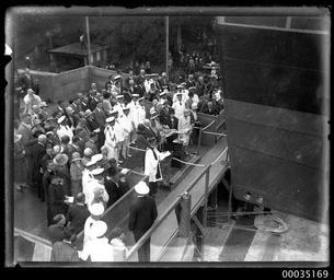 | Keywords: hood collection hoodcollection 35175 samuel j hood collection samueljhoodcollection hood hmas albatross hmasalbatross royal australian navy royalaustraliannavy navy naval vessel navalvessel sydney launch naval personnel navalpersonnel naval officers navalofficers officials navy event navyevent cockatoo island cockatooisland cockatoo island dockyards cockatooislanddockyards 1928 reverend a g rix reverendagrix lady ethel stonehaven ladyethelstonehaven lord john lawrence baird stonehaven lordjohnlawrencebairdstonehaven lord stonehaven lordstonehaven seaplane carrier seaplanecarrier ship warship ran hmas albatross (1928) hmasalbatross1928 seaplane tender seaplanetender royal navy royalnavy hms albatross hmsalbatross cockatoo docks and engineering company cockatoodocksandengineeringcompany cockatoo island dockyard cockatooislanddockyard shipyard ship launching shiplaunching blackandwhite monochrome photo border black and white This photograph depicts the launch of the Royal Australian Navy's first seaplane carrier HMAS ALBATROSS I on 23 February 1928 at Cockatoo Island Dockyard in Sydney. The woman at the centre of the photograph holding the rope is Lady Ethel Stonehaven, wife of Lord John Lawrence Baird Stonehaven, the Governor-General of Australia. Lady Stonehaven launched the vessel and performed a ceremonial christening by releasing a bottle of Australian wine. The Reverend A G Rix is also visible in the photograph, conducting a religious service also from the launching platform. This photo is part of the Australian National Maritime Museum’s Samuel J. Hood Studio collection. Sam Hood (1872-1953) was a Sydney photographer with a passion for ships. His 60-year career spanned the romantic age of sail and two world wars. The photos in the collection were taken mainly in Sydney and Newcastle during the first half of the 20th century. The ANMM undertakes research and accepts public comments that enhance the information we hold about images in our collection. This record has been updated accordingly. Photographer: Samuel J. Hood Studio Collection Object no. 00035169 This photograph depicts the launch of the Royal Australian Navy's first seaplane carrier HMAS ALBATROSS I on 23 February 1928 at Cockatoo Island Dockyard in Sydney. The woman at the centre of the photograph holding the rope is Lady Ethel Stonehaven, wife of Lord John Lawrence Baird Stonehaven, the Governor-General of Australia. Lady Stonehaven launched the vessel and performed a ceremonial christening by releasing a bottle of Australian wine. The Reverend A G Rix is also visible in the photograph, conducting a religious service also from the launching platform. This photo is part of the Australian National Maritime Museum’s Samuel J. Hood Studio collection. Sam Hood (1872-1953) was a Sydney photographer with a passion for ships. His 60-year career spanned the romantic age of sail and two world wars. The photos in the collection were taken mainly in Sydney and Newcastle during the first half of the 20th century. The ANMM undertakes research and accepts public comments that enhance the information we hold about images in our collection. This record has been updated accordingly. Photographer: Samuel J. Hood Studio Collection Object no. 00035169 |