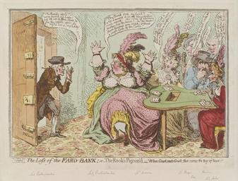 Keywords: The Loss of the Faro Bank James Gillray 1797.jpg en The loss of the faro bank; or - the rook's pigeon'd hand-coloured etching by English caricaturist James Gillray published by Hannah Humphrey Pictured among others are George Hobart 3rd Earl of Buckinghamshire Image courtesy of the National Portrait Gallery London National Portrait Gallery London http //www npg org uk/collections/search/portrait php search ss firstRun true sText hobart LinkID mp61717 rNo 0 role sit Creator James Gillray 1797-02-02 James Gillray PD-old-100 |