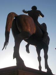 Keywords: sutton surrey sutton, surrey suttonsurrey sutton, london suttonlondon sculpture sir david wynne sirdavidwynne london london borough of sutton londonboroughofsutton reed the quadrant thequadrant horse horse and rider horseandrider 1981 art statue public art publicart outdoor See Wikipedia article: The Messenger is a statue by the English sculptor David Wynne, OBE of a horse and rider. It was installed in the town centre of Sutton in Greater London, England in 1981. Features: The statue features a horse and rider, created in bronze with very dark patination. It is located directly outside the main entrance to Quadrant House (in the Quadrant), adjacent to Sutton railway station. The horse, with a slightly raised left leg, looks towards the station. The rider, seated bareback, raises his left hand in the air above his head and his right hand to his mouth, as if calling out. It is fully life-size and mounted on a 7 foot plinth of marble and granite slabs. The total height is 150 inches. Commissioning and the brief: The statue was commissioned by the then Business Press International Ltd, and upkeep of the work now falls to Reed Business Information, who occupy Quadrant House. It was a major commission for Wynne, which took four years from his first idea and inspiration on receipt of the brief through roughing out, refining and foundry to the final unveiling and installation. The brief given to him by the company was to illustrate the fundamental business of the company, namely communication, but to convey the idea, rather than simply to represent the work of the company in a direct or very obvious way. Location: The company had initially considered that the work should be installed high up, above the entrance lobby. However, Wynne advised against this, feeling that the distance created would militate against the engagement he wanted people to have with the work. It would be perceived as two-dimensional, depriving people of the full three-dimensions they would feel by walking around it. So the statue was installed at ground level in front of the entrance to the building, enabling people to get close up to it. Moment of inspiration: Having agreed the overall idea that the work was to convey, Wynne had to consider what actual form the sculpture would take to best capture the idea of communication. When inspiration came to him, it did so "like a flash of light, complete", as he put it: "A tall wise horse that had never known a bridle, a magic horse if you like, poised, one foot pointing to the centre of the earth; head up, nostrils flared, about to whip round and plunge away. On his back a carefree boy, wild as the horse, calling out to his friends, who have forgotten that they too are heirs to his kingdom." Preparation: As part of his preparation, Wynne visited Italy to see the Equestrian Statue of Marcus Aurelius in Rome and the Horses of Saint Mark in Venice. Unveiling: Describing his thoughts moments before the unveiling, David Wynne wrote in his 1982 book The Messenger. "It is a proud moment for the sculptor when he sees a crowd of expectant and rather puzzled people gazing at an ungainly shrouded shape in the most prominent position outside a gleaming new building. Will they be surprised, pleased, disappointed or even appalled when the cover comes off? Too late to change it now!" Wynne's idea of the relationship between the horse and man: In his introductory essay in the book The Messenger, Lucius Noël notes Wynne's dislike for statues where the horse is shown as merely the support for the rider. Noël notes the way that Wynne highlights the interrelationship between horse and rider in the work, as he did in his previous two horse and rider sculptures. While noting the greater reality in the work than its two equestrian predecessors, he stresses the strong symbolism in the work. He writes: "The rider, a young man, is giving his message to his audience, and seems to be saying that there is another world that all should know about. But the horse is just as important as the man. His is, in fact, more concious than the man, and has his feet firmly planted on the ground, one hoof pointing to the centre of the earth. They are a team, and the overall impression is that each needs the other: man needs the horse, as much as the horse needs man." Noël notes how this analysis ties in with Wynne's wider views about animals: "We must share the Earth with the animals, who have as much right to it as we do. To find a way to live in peace with the animals is our duty." See Wikipedia article: The Messenger is a statue by the English sculptor David Wynne, OBE of a horse and rider. It was installed in the town centre of Sutton in Greater London, England in 1981. Features: The statue features a horse and rider, created in bronze with very dark patination. It is located directly outside the main entrance to Quadrant House (in the Quadrant), adjacent to Sutton railway station. The horse, with a slightly raised left leg, looks towards the station. The rider, seated bareback, raises his left hand in the air above his head and his right hand to his mouth, as if calling out. It is fully life-size and mounted on a 7 foot plinth of marble and granite slabs. The total height is 150 inches. Commissioning and the brief: The statue was commissioned by the then Business Press International Ltd, and upkeep of the work now falls to Reed Business Information, who occupy Quadrant House. It was a major commission for Wynne, which took four years from his first idea and inspiration on receipt of the brief through roughing out, refining and foundry to the final unveiling and installation. The brief given to him by the company was to illustrate the fundamental business of the company, namely communication, but to convey the idea, rather than simply to represent the work of the company in a direct or very obvious way. Location: The company had initially considered that the work should be installed high up, above the ent