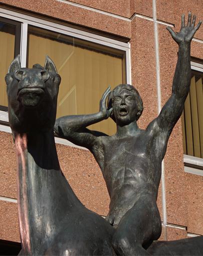 Keywords: sutton surrey sutton, surrey suttonsurrey sutton, london suttonlondon sculpture sir david wynne sirdavidwynne london london borough of sutton londonboroughofsutton reed the quadrant thequadrant horse horse and rider horseandrider 1981 art statue public art publicart See Wikipedia article: The Messenger is a statue by the English sculptor David Wynne, OBE of a horse and rider. It was installed in the town centre of Sutton in Greater London, England in 1981. Features: The statue features a horse and rider, created in bronze with very dark patination. It is located directly outside the main entrance to Quadrant House (in the Quadrant), adjacent to Sutton railway station. The horse, with a slightly raised left leg, looks towards the station. The rider, seated bareback, raises his left hand in the air above his head and his right hand to his mouth, as if calling out. It is fully life-size and mounted on a 7 foot plinth of marble and granite slabs. The total height is 150 inches. Commissioning and the brief: The statue was commissioned by the then Business Press International Ltd, and upkeep of the work now falls to Reed Business Information, who occupy Quadrant House. It was a major commission for Wynne, which took four years from his first idea and inspiration on receipt of the brief through roughing out, refining and foundry to the final unveiling and installation. The brief given to him by the company was to illustrate the fundamental business of the company, namely communication, but to convey the idea, rather than simply to represent the work of the company in a direct or very obvious way. Location: The company had initially considered that the work should be installed high up, above the entrance lobby. However, Wynne advised against this, feeling that the distance created would militate against the engagement he wanted people to have with the work. It would be perceived as two-dimensional, depriving people of the full three-dimensions they would feel by walking around it. So the statue was installed at ground level in front of the entrance to the building, enabling people to get close up to it. Moment of inspiration: Having agreed the overall idea that the work was to convey, Wynne had to consider what actual form the sculpture would take to best capture the idea of communication. When inspiration came to him, it did so "like a flash of light, complete", as he put it: "A tall wise horse that had never known a bridle, a magic horse if you like, poised, one foot pointing to the centre of the earth; head up, nostrils flared, about to whip round and plunge away. On his back a carefree boy, wild as the horse, calling out to his friends, who have forgotten that they too are heirs to his kingdom." Preparation: As part of his preparation, Wynne visited Italy to see the Equestrian Statue of Marcus Aurelius in Rome and the Horses of Saint Mark in Venice. Unveiling: Describing his thoughts moments before the unveiling, David Wynne wrote in his 1982 book The Messenger. "It is a proud moment for the sculptor when he sees a crowd of expectant and rather puzzled people gazing at an ungainly shrouded shape in the most prominent position outside a gleaming new building. Will they be surprised, pleased, disappointed or even appalled when the cover comes off? Too late to change it now!" Wynne's idea of the relationship between the horse and man: In his introductory essay in the book The Messenger, Lucius Noël notes Wynne's dislike for statues where the horse is shown as merely the support for the rider. Noël notes the way that Wynne highlights the interrelationship between horse and rider in the work, as he did in his previous two horse and rider sculptures. While noting the greater reality in the work than its two equestrian predecessors, he stresses the strong symbolism in the work. He writes: "The rider, a young man, is giving his message to his audience, and seems to be saying that there is another world that all should know about. But the horse is just as important as the man. His is, in fact, more concious than the man, and has his feet firmly planted on the ground, one hoof pointing to the centre of the earth. They are a team, and the overall impression is that each needs the other: man needs the horse, as much as the horse needs man." Noël notes how this analysis ties in with Wynne's wider views about animals: "We must share the Earth with the animals, who have as much right to it as we do. To find a way to live in peace with the animals is our duty." See Wikipedia article: The Messenger is a statue by the English sculptor David Wynne, OBE of a horse and rider. It was installed in the town centre of Sutton in Greater London, England in 1981. Features: The statue features a horse and rider, created in bronze with very dark patination. It is located directly outside the main entrance to Quadrant House (in the Quadrant), adjacent to Sutton railway station. The horse, with a slightly raised left leg, looks towards the station. The rider, seated bareback, raises his left hand in the air above his head and his right hand to his mouth, as if calling out. It is fully life-size and mounted on a 7 foot plinth of marble and granite slabs. The total height is 150 inches. Commissioning and the brief: The statue was commissioned by the then Business Press International Ltd, and upkeep of the work now falls to Reed Business Information, who occupy Quadrant House. It was a major commission for Wynne, which took four years from his first idea and inspiration on receipt of the brief through roughing out, refining and foundry to the final unveiling and installation. The brief given to him by the company was to illustrate the fundamental business of the company, namely communication, but to convey the idea, rather than simply to represent the work of the company in a direct or very obvious way. Location: The company had initially considered that the work should be installed high up, above the entrance lo