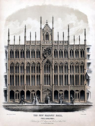Keywords: library company of philadelphia librarycompanyofphiladelphia lithography (philadelphia, pa.) lithographyphiladelphiapa philadelphia on stone philadelphiaonstone chillas, david chillasdavid friend & aub friendaub simpson, john g. simpsonjohng sloan & stewart sloanstewart tholey, charles p., d. 1898 tholeycharlespd1898 masonic buildings (philadelphia, pa.) masonicbuildingsphiladelphiapa building architecture Exterior view showing the four-story Gothic-style hall built 1853-1855 after the designs of Sloan & Stewart at 713-721 Chestnut Street. A small portion of the adjacent Washington House hotel signboard is visible (right). On the sidewalk, eleven pedestrians (men wearing top hats and canes, women with parasols, and a child wearing a wide-brimmed hat) greet one another, converse, stroll, and admire the building. Hall building sold circa 1873 following the completion of the new Masonic Temple on North Broad Street. Exterior view showing the four-story Gothic-style hall built 1853-1855 after the designs of Sloan & Stewart at 713-721 Chestnut Street. A small portion of the adjacent Washington House hotel signboard is visible (right). On the sidewalk, eleven pedestrians (men wearing top hats and canes, women with parasols, and a child wearing a wide-brimmed hat) greet one another, converse, stroll, and admire the building. Hall building sold circa 1873 following the completion of the new Masonic Temple on North Broad Street. |