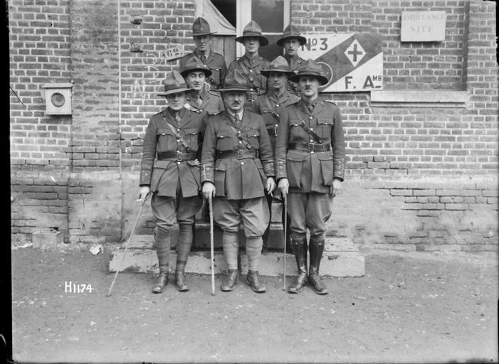 | Keywords: blackandwhite monochrome black and white A group portrait of the officers of the No. 3 New Zealand Field Ambulance serving in France during World War I. They are standing in front of a sign on a wall with a fern leaf and red cross plus the letters 'No. 3' and 'F. Amb.' Photograph taken at Louvencourt 30 April 1918 by Henry Armytage Sanders. Inscriptions: Inscribed - Photographer's title on negative -bottom left: H1174. Quantity: 1 b&w original negative(s). Physical Description: Dry plate glass negative 4 x 5 inches The officers of No. 3 New Zealand Field Ambulance, World War I. Royal New Zealand Returned and Services' Association :New Zealand official negatives, World War 1914-1918. Ref: 1/2-013722-G. Alexander Turnbull Library, Wellington, New Zealand. natlib.govt.nz/records/22726440 A group portrait of the officers of the No. 3 New Zealand Field Ambulance serving in France during World War I. They are standing in front of a sign on a wall with a fern leaf and red cross plus the letters 'No. 3' and 'F. Amb.' Photograph taken at Louvencourt 30 April 1918 by Henry Armytage Sanders. Inscriptions: Inscribed - Photographer's title on negative -bottom left: H1174. Quantity: 1 b&w original negative(s). Physical Description: Dry plate glass negative 4 x 5 inches The officers of No. 3 New Zealand Field Ambulance, World War I. Royal New Zealand Returned and Services' Association :New Zealand official negatives, World War 1914-1918. Ref: 1/2-013722-G. Alexander Turnbull Library, Wellington, New Zealand. natlib.govt.nz/records/22726440 |