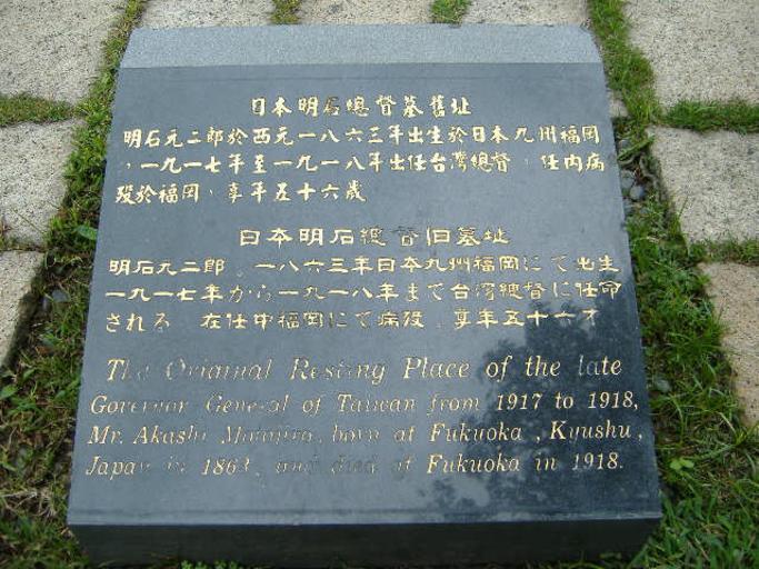 Keywords: The Original Resting Place of the late Governor General Akashi.JPG en The Original Resting Place of the late Governor General Akashi ja 日 明石元二郎総 旧墓 zh-tw 日 明石元二郎總 墓舊 I took this photo 人撮影 24 February 2008 2008年2 24日 あばさー Motojiro Akashi Plaques in Taiwan Monuments and memorials in Taipei Lin Sen Park |