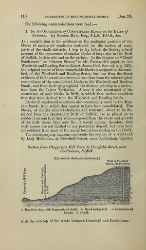 | Keywords: The Quarterly journal of the Geological Society of London (13071276964).jpg 110 <br> PEOCEEDINGS OF THE GEOLOGICAL SOCIETY Jan 23 <br> The following communications were read ” <br> 1 On the OccTTEREiTCE o/ CoN soLiDATED Blocks in the Drift of <br> Suffolk By Geoege Maw Esq F L S F G S c <br> As a contribution to the evidence on the geological position of the <br> blocks of saccharoid sandstone scattered on the surface of many- <br> parts of the chalk- districts I beg to lay before the Society a brief <br> account of the occurrence of similar blocks of large size in the Drift <br> of Suffolk both in situ and on the surface In the chapter on Druid <br> Sandstones or 'Sarsen Stones in Mr Prestwich's paper on the <br> Woolwich and Eeading Series Quart Journ Geol Soc vol x p 123 <br> the original source of these remarkable blocks is assig-ned to the sand- <br> beds of the Woolwich and Reading Series but less from the direct <br> evidence of their actual occurrence in situ than from the mineralogical <br> resemblance of the consolidated blocks to the Woolwich and Beading <br> Sands and from their geographical distribution pointing to a deriva- <br> tion from the Lower Tertiaries A case is also mentioned of the <br> occurrence of such blocks in Drift in which that author considers <br> that they were derived from the Woolwich and Reading Sands <br> Blocks of saccharoid sandstone also occasionally occur in the Bag- <br> shot Sands from which they appear to have been consolidated The <br> blocks of similar mineral character and structure about to be de- <br> scribed from the Quaternary Drift of Suffolk are so placed as to <br> render it certain that they were composed from the sands and gravels <br> of the drift where they now lie ; it would appear therefore that <br> such masses are not limited to any particular deposit but have been <br> consolidated from most of the sandy formations resting on the Chalk <br> The accompanying diagram represents the section of a well sunk <br> by Lady Middleton at Crowfield-Street near Coddenham together <br> Section from Chopping s Hill Farm to Crowfield-Street near <br> Coddenham Suffolk <br> Horizontal distance condensed <br> Well at Crowfleld <br> Street 111 feet deep <br> a Boulder-clay with fragments of chalk b Sand and gravel <br> blocks c Chalk <br> X Consolidated <br> with the outcrop of the strata between Crowiield and Coddenham 36344837 112028 51125 Page 110 Text v 23 http //www biodiversitylibrary org/page/36344837 1867 Geological Society of London Biodiversity Heritage Library The Quarterly journal of the Geological Society of London v 23 1867 Geology Periodicals Smithsonian Libraries bhl page 36344837 dc identifier http //biodiversitylibrary org/page/36344837 smithsonian libraries Information field Flickr posted date ISOdate 2014-03-10 Check categories 2015 August 26 CC-BY-2 0 BioDivLibrary https //flickr com/photos/61021753 N02/13071276964 2015-08-26 14 57 36 cc-by-2 0 PD-old-70-1923 The Quarterly journal of the Geological Society of London 1867 The Quarterly journal of the Geological Society of London 1867 Photos uploaded from Flickr by Fæ using a script |
