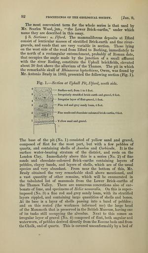 | Keywords: The Quarterly journal of the Geological Society of London (13071052423).jpg 92 PHOCEteDINGS OF THE GEOLOGICAL SOCIETY Jan 9 <br> The most convenient term for the whole series is that used by <br> Mr Searles Wood jun the Lower Brick-earths under which <br> name they are described in this essay <br> §3 Sections a Ilford The mammaliferous deposits at Ilford <br> consist of lenticular masses of stratified Brick-earth and fine river- <br> gravels and sands that are very variable in section Those lying <br> on the west side of the road from Ilford to Barking immediately to <br> the north of a rectangular entrenchment probably of Eoman date <br> that occupies the angle made by the junction of a small affluent <br> with the river Eoding constitute the Uphall brickfields elevated <br> about 30 feet above the alluvium of the Thames The pit in which <br> the remarkable skull of Rhinoceros leptoi-Mnus Owen was found by <br> Mr Antonio Brady in 1865 presented the following section Pig 1 <br> I'ig 1 ” Section at Uphall Pit Ilford south side <br> ” Surface-soil from 1 to 3 feet <br> ” Irregularly stratified brick-earth and gravel 6 feet <br> Irregular layer of flint-gravel 1 foot <br> ” Fine red and grey sandy loam 4 feet <br> Fine sands and chocolate-coloured brick-earths 6 feet <br> Yellow sand and gravel <br> The base of the pit No 1 consisted of yellow sand and gravel <br> composed of flint for the most part but with a few pebbles of <br> quartz and containing shells of Anodon and Corhicida It is the <br> surface water-bearing stratum of the district and rests on the <br> London Clay Immediately above this is a series N'o 2 of fine <br> sands and chocolate -coloured Brick-earths containing layers of <br> pebbles clayey bands and layers of shells which are of the usual <br> species and very abundant Prom near the bottom of this Mr <br> Brady obtained the very remarkable skull above mentioned and <br> a vast quantity of other remains which will be enumerated in <br> the tabulated list of mammals from the Lower Brick-earths of <br> the Thames Valley There are numerous concretions also of car- <br> bonate of lime and specimens of Helix nemoimlis On this is super- <br> imposed No 3 a fine red and grey sandy loam with its stratified <br> layers rippled and containing large quantities of shells and bones <br> At its base is a layer of shells passing into a band of pebbles ; <br> and on this rested the workmen informed me the large head <br> of the Mammoth that is preserved in the British Museum having one <br> of its tusks still occupying the alveolus Next to this comes an <br> irregular layer of gravel No 4 composed of flint both angular and <br> waterworn of pebbles derived directly from the Eocene beds and from <br> the Chalk and of quartz This is covered unconformably by a bed of 36344819 112028 51125 Page 92 Text v 23 http //www biodiversitylibrary org/page/36344819 1867 Geological Society of London NameFound Anodon NameConfirmed Anodon EOLID 4752261 NameBankID 112384 Biodiversity Heritage Library The Quarterly journal of the Geological Society of London v 23 1867 Geology Periodicals Smithsonian Libraries bhl page 36344819 dc identifier http //biodiversitylibrary org/page/36344819 smithsonian libraries Information field Flickr posted date ISOdate 2014-03-10 Check categories 2015 August 26 CC-BY-2 0 BioDivLibrary https //flickr com/photos/61021753 N02/13071052423 2015-08-26 14 54 44 cc-by-2 0 PD-old-70-1923 The Quarterly journal of the Geological Society of London 1867 The Quarterly journal of the Geological Society of London 1867 Photos uploaded from Flickr by Fæ using a script |