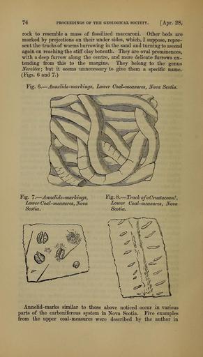 Keywords: The Quarterly journal of the Geological Society of London (12981059073).jpg 74 <br> PEocEEDEsres or tke geological society Api - 28 <br> rock to resemble a mass of fossilized maccaroni Other beds are <br> marked bj projections on their under sides which I suppose repre- <br> sent the tracks of worms burrowing in the sand and turning to ascend <br> again on reaching the stiff clay beneath Thev are oval prominences <br> with a deep furrow along the centre and more delicate furrows ex- <br> tending from this to the margins They belong to the genus <br> Nereites ; but it seems unnecessary to give them a specific name <br> Figs 6 and 7 <br> Fig 6 ” Annelide-markings Lower Coal-measures Nova Scotia <br> Fig 7 ” Annelide-marTcings <br> Lower Coal-measures Nova <br> Scotia <br> Fig 8 ” Trade of aCrustacean <br> Lower Coal-measures Nova <br> Scotia <br> tl <br> Annelid-marks similar to those above noticed occur in various <br> parts of the carboniferous system in Nova Scotia Five examples <br> from the upper coal-measures were described by the author in 36161611 111474 51125 Page 74 Text v 15 http //www biodiversitylibrary org/page/36161611 1859 Geological Society of London NameFound Nereites NameConfirmed Nereites NameBankID 4257309 Biodiversity Heritage Library The Quarterly journal of the Geological Society of London v 15 1859 Geology Periodicals Smithsonian Libraries bhl page 36161611 dc identifier http //biodiversitylibrary org/page/36161611 smithsonian libraries Information field Flickr posted date ISOdate 2014-03-07 Check categories 2015 August 26 CC-BY-2 0 BioDivLibrary https //flickr com/photos/61021753 N02/12981059073 2015-08-26 14 56 22 cc-by-2 0 PD-old-70-1923 The Quarterly journal of the Geological Society of London 1859 Photos uploaded from Flickr by Fæ using a script |