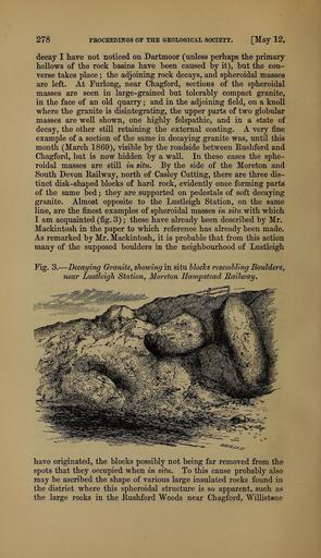 Keywords: The Quarterly journal of the Geological Society of London (12961316143).jpg 278 <br> PROCEEDINGS OF THE GEOLOGICAL SOCIETY May 12 <br> decay I have not noticed on Dartmoor unless perhaps the primary <br> hollows of the rock basins have been caused by it but the con- <br> verse takes place ; the adjoining rock decays and spheroidal masses <br> are left At Furlong near Chagford sections of the spheroidal <br> masses are seen in large-grained but tolerably compact granite <br> in the face of an old quarry ; and in the adjoining field on a knoll <br> where the granite is disintegrating the upper parts of two globular <br> masses are well shown one highly felspathic and in a state of <br> decay the other still retaining the external coating A very fine <br> example of a section of the same in decaying granite was until this <br> month March 1869 visible by the roadside between Rushford and <br> Chagford but is now hidden by a wall In these cases the sphe- <br> roidal masses are still in situ By the side of the Moreton and <br> South Devon Railway north of Casley Cutting there are three dis- <br> tinct disk-shaped blocks of hard rock evidently once forming parts <br> of the same bed ; they are supported on pedestals of soft decaying <br> granite Almost opposite to the Lustleigh Station on the same <br> line are the finest examples of spheroidal masses in situ with which <br> I am acquainted fig 3 ; these have already been described by Mr <br> Mackintosh in the paper to which reference has already been made <br> As remarked by Mr Mackintosh it is probable that from this action <br> many of the supposed boulders in the neighbourhood of Lustleigh <br> Fig 3 - <br> ” Decaying Granite showing in situ blocks resembling Boulders <br> near iMStleigh Station Moreton ffanvpstead Railway <br> – s c <br> have originated the blocks possibly not being far removed from the <br> spots that they occupied when in situ To this cause probably also <br> may be ascribed the shape of various large insulated rocks found in <br> the district where this spheroidal structure is so apparent such as <br> the large rocks in the Rushford Woods near Chagford Willist ne 36103125 111288 51125 Page 278 Text v 25 http //www biodiversitylibrary org/page/36103125 1869 Geological Society of London Biodiversity Heritage Library The Quarterly journal of the Geological Society of London v 25 1869 Geology Periodicals Smithsonian Libraries bhl page 36103125 dc identifier http //biodiversitylibrary org/page/36103125 smithsonian libraries Information field Flickr posted date ISOdate 2014-03-06 Check categories 2015 August 26 CC-BY-2 0 BioDivLibrary https //flickr com/photos/61021753 N02/12961316143 2015-08-26 15 55 12 cc-by-2 0 PD-old-70-1923 The Quarterly journal of the Geological Society of London 1869 Photos uploaded from Flickr by Fæ using a script |