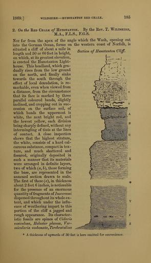 Keywords: The Quarterly journal of the Geological Society of London (12961280663).jpg 1869 <br> WILTSHIRE HUNSTANTON EED CHALK <br> 185 <br> 2 On the Ued Chalk of Hunstanton By the Rev T Wiltshire <br> M A FX S F G S <br> Not far from the apex of the angle which the Wash opening out <br> into the German Ocean forms on the western coast of Norfolk is <br> situated a cliff of about a mile in rr m - <br> 1 i J rr / A i i- ˘ V ˘ u - Section of Hunstanton L lilt <br> length and 50 or 60 feet m height ™¦' <br> on which at its greatest elevation <br> is erected the Hunstanton Light- <br> house This headland which gra- <br> dually rises from the low ground <br> on the north and finally sinks <br> towards the south through the <br> effect of local denudation is re- <br> markable even when viewed from <br> a distance from the circumstance <br> that its face is marked by three <br> parallel coloured bands slightly <br> inclined and cropping out in suc- <br> cession on the surface soil of <br> which bands the uppermost is <br> white the next bright red and <br> the lowest yellow each division <br> being sharply defined mthout any <br> intermingling of tints at the lines <br> of contact A close inspection <br> shows that the highest stratum <br> the white consists of a hard cal- <br> careous substance compact in tex- <br> ture and much shattered and <br> fissured originally deposited in <br> such a manner that its materials <br> were arranged in definite layers <br> two of which a 6 those forming <br> the base are represented in the <br> annexed section drawn to scale <br> The first of these a in thickness <br> about 2 feet 6 inches is noticeable <br> for the presence of an enormous <br> quantity of fragments of Inocerami <br> dispersed throughout its whole ex- <br> tent and which under the influ- <br> ence of weathering impart to this <br> portion of the cliff a jagged and <br> rough appearance Its character- <br> istic fossils are spines of Cidaris <br> vesiculosa Holaster planus Ver- <br> micularia umbonata Terehratulina <br> A thickness of upwards of 30 feet is here omitted for convenience 36103030 111288 51125 Page 185 Text v 25 http //www biodiversitylibrary org/page/36103030 1869 Geological Society of London NameFound Cidaris vesiculosa NameConfirmed Cidaris vesiculosa NameFound Holaster planus NameConfirmed Holaster planus NameFound Terehratulina Biodiversity Heritage Library The Quarterly journal of the Geological Society of London v 25 1869 Geology Periodicals Smithsonian Libraries bhl page 36103030 dc identifier http //biodiversitylibrary org/page/36103030 smithsonian libraries Information field Flickr posted date ISOdate 2014-03-06 Check categories 2015 August 26 CC-BY-2 0 BioDivLibrary https //flickr com/photos/61021753 N02/12961280663 2015-08-26 15 54 16 cc-by-2 0 PD-old-70-1923 The Quarterly journal of the Geological Society of London 1869 Photos uploaded from Flickr by Fæ using a script |