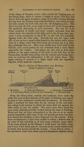 Keywords: The Quarterly journal of the Geological Society of London (12961112575).jpg 130 <br> PROCEEDJNGS OF THE GEOLOGICAL SOCIETY DeC 23 <br> of the village of Tungiiu twelve miles outside the Taiping gate to <br> the Chung-shan where it attains a height of about 1700 feet and <br> thence descends again forming a range of low hills running through <br> the city from the Taiping-men under the Kulow and ending in some <br> low hiUs outside the west wall near the old Tsingliang-men The <br> dip is towards the S E at an angle of about 30° in the Chung-shan <br> but gradually decreasing at each extremity The bed No 3 as <br> being composed of harder and more compact materials than the <br> others forms the summits of the hills and in the Chung-shan pre- <br> sents a steep escarpment to the N W on the S E face gradually <br> dipping under the later beds Towards the east the upper beds <br> No 4 run up into a small valley formed in the earlier rocks where <br> close by a village called Pah-hwei-miau see section fig 3 p 124 <br> they gradually thin out Here some shafts have been sunk by the <br> Chinese and a small portion of coal extracted from a seam which <br> approaches the surface Coal-mines are also said to have been <br> worked on the upper outcrop of the beds on the S E face of the <br> Chung-shan though when going over the country previously how- <br> ever to receiving the information I did not notice them This <br> upper outcrop is covered to a slight depth with the superficial <br> deposits which mask the sequence <br> Fig 5 ” Section of Chung-slian near Nanking <br> Scale 4 miles to 1 inch <br> Plain of <br> Nanking <br> Said to be <br> Coal <br> Chung- <br> ehan <br> Taiping <br> Gate <br> Chung-shan series Tungting Eocka <br> 1 Red Grits 2 Dark-red Flagstones 3 Quartzose Conglomerate <br> 4 Coal-bearing Rocks overlain by later formations 5 Htematite-bed <br> From the Chung-shan easterly and southerly these rocks dip <br> under the more modern deposits of the plain of Nanking and appear <br> in parts to have undergone considerable denudation At Pah-hwei- <br> miau I searched for some time for the outcrop of the coal-beds; <br> but owing to the manner in which the strata died out against the <br> older rocks it was not visible The mines have been closed for <br> some years although partially worked during the siege of Nanking <br> Water and foul air have accumulated in the pits so as to render <br> descent impossible while most of the old inhabitants have lost their <br> lives during the rebellion or been dispersed over the country From <br> these circumstances I have been unable to obtain a definite idea of <br> the value of this coal-field or of how many workable seams exist <br> Of the seam worked by the Chinese I could learn but little some <br> said it was 3 feet thick some 8 ; but none of the actual miners could <br> be found they having all left the country I was able to obtain a <br> few specimens of the coal which was of a bituminous slightly caking 36102975 111288 51125 Page 130 Text v 25 http //www biodiversitylibrary org/page/36102975 1869 Geological Society of London Biodiversity Heritage Library The Quarterly journal of the Geological Society of London v 25 1869 Geology Periodicals Smithsonian Libraries bhl page 36102975 dc identifier http //biodiversitylibrary org/page/36102975 smithsonian libraries Information field Flickr posted date ISOdate 2014-03-06 Check categories 2015 August 26 CC-BY-2 0 BioDivLibrary https //flickr com/photos/61021753 N02/12961112575 2015-08-26 15 53 43 cc-by-2 0 PD-old-70-1923 The Quarterly journal of the Geological Society of London 1869 Photos uploaded from Flickr by Fæ using a script |