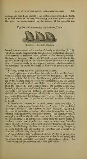 Keywords: The Quarterly journal of the Geological Society of London (12960575004).jpg J W DATIS OX THE GEXTJ8 PLEUR ACANTHUS AGASS 335 <br> surfaces are round and smooth ; the posterior is depressed one tenth <br> of an inch across at the base contracting to a small groove towards <br> the apex ; the angles formed by the contact of the posterior and <br> Fig 10 ” Pleuracantlius denticidatus Davis <br> Denticles of the spine enlarged <br> lateral faces are armed with a series of closely set denticles fig 10 <br> which are small comparatively broad at base contracting suddenly <br> then forming a carinated apex pointed at the extremity towards <br> the base of the spine There are 20 denticles on each side in the <br> space of an inch ; and in the specimen figured there are 45 on each <br> side A circular cavity which appears as usual to be terminal ex- <br> tends towards the point ; it is large in diameter in proportion to the <br> spine <br> Locality Better-bed Coal Clifton near Halifax <br> Several specimens which have been obtained from the Cannel <br> Coal at Tingley may probably be referred to this genus They pre- <br> sent some points of difference ; but these may probably be accounted <br> for by the relative position of the two stratigraphically the Cannel <br> Coal being several hundred feet higher in the Coal-measure series <br> than the Bone-bed The Tingley spines are slightly compressed <br> laterally ; the anterior and lateral faces are striated near the basal <br> extremity ; the posterior denticles are small and much resemble <br> those of the Bone-bed specimens ; the base is better exposed its walls <br> are rather thin and the internal cavity is large ; the spines ex- <br> pand towards the base A perfect example will be about 3 5 inches <br> in length <br> P denticidatus appears to be most nearly associated with P <br> Wardi and with a spine described by Dr Newberry in the Palae- <br> ontological volume of the ' Survey of Ohio ' vol i p 332 pi lix <br> fig 4 as Ortliacanilius arcuatus The latter is described as finely <br> striated longitudinally on the anterior surface ” the posterior surface <br> occupying one third the circumference and having a low ridge along <br> the median line The denticles extending along the latero-posterior <br> angles are much closer together and more numerous and from the <br> figure appear to be quite different in character from those in my spe- <br> cimen In all these particulars the two species arc clearly divergent ; <br> in other respects they are similar ; in curvature and general form <br> they are evidently very closely related <br> P denticidatus is easily distinguished from P Wardi by the largo <br> size of the latter the pecuHar squareness of its lateral faces and <br> its obtuse teeth connected together by intermediate ridges In <br> these respects they differ essentially from each other 36090694 111264 51125 Page 335 Text 36 http //www biodiversitylibrary org/page/36090694 1880 Geological Society of London NameFound Ortliacanilius arcuatus NameFound P denticidatus NameFound Pleuracantlius denticidatus Biodiversity Heritage Library The Quarterly journal of the Geological Society of London v 36 1880 Geology Periodicals Smithsonian Libraries bhl page 36090694 dc identifier http //biodiversitylibrary org/page/36090694 smithsonian libraries Information field Flickr posted date ISOdate 2014-03-06 Check categories 2015 August 26 CC-BY-2 0 BioDivLibrary https //flickr com/photos/61021753 N02/12960575004 2015-08-26 15 51 02 cc-by-2 0 PD-old-70-1923 The Quarterly journal of the Geological Society of London 1880 Photos uploaded from Flickr by Fæ using a script |