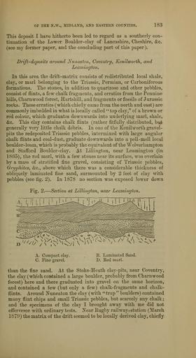 | Keywords: The Quarterly journal of the Geological Society of London (12960188103).jpg OP THE N W MrDL iXD AND EASTERN COUNTIES <br> 183 <br> This deposit I have hitherto been led to regard as a southerly con- <br> tinuation of the Lower Boulder-clay of Lancashire Cheshire c <br> see my former paper and the concluding part of this paper <br> Drift- <br> around Nuneaton Coventry Kenilworth and <br> Leamington <br> In this area the drift-matrix consists of redistributed local shale <br> clay or marl belonging to the Triassic Permian or Carboniferous <br> formations The stones in addition to quartzose and other pebbles <br> consist of flints a few chalk fragments and erratics from the Pennine <br> hills Charnwood forest HartshiU and fragments or fossils of Jurassic <br> rocks These erratics which chieiiy came from the north and east are <br> commonly imbedded in what is locally called top clay of a brown or <br> red colour which graduates downwards into underlying marl shale <br> c This clay contains chalk flints rather fitfully distributed but <br> generally very little chalk debris In one of the Kenilworth gravel- <br> pits the redeposited Triassic pebbles intermixed with large angnlar <br> chalk flints and coal-dust graduate downwards into a pell-mell local <br> boulder-loam which is probably the equivalent of the Wolverhampton <br> and Stafl'ord Boulder-clay t Lillington near Leamington in <br> 1865 the red marl with a few stones near its surface was overlain <br> by a mass of stratified fine gravel consisting of Triassic pebbles <br> Gn/phites c above which there was a considerable thickness of <br> obliquely laminated fine sand surmounted by 2 feet of clay with <br> pebbles see fig 2 In 1878 no section was exposed lower down <br> Fig 2 ” Section at Lillington near Leamington <br> A Compact clay <br> C Fine gravel <br> B Laminated Sand <br> D Eed marl <br> than the fine sand At the Stoke-Heath clay-pits near Coventry <br> the clay which contained a large boulder probably from Charnwood <br> forest here and there graduated into gravel on the same horizon <br> and contained a few but only a few chalk-f -agments and chalk- <br> flints Around Nuneaton the clay with trap boulders contained <br> many flint chips and small Triassic pebbles but scarcely any chalk; <br> and the specimens of the clay I brought away with me did not <br> efi'crvesce with ordinary tests Xear Ilugby railway-station March <br> 1870 the matrix of the drift seemed to be locally derived clay chiefly 36090526 111264 51125 Page 183 Text 36 http //www biodiversitylibrary org/page/36090526 1880 Geological Society of London Biodiversity Heritage Library The Quarterly journal of the Geological Society of London v 36 1880 Geology Periodicals Smithsonian Libraries bhl page 36090526 dc identifier http //biodiversitylibrary org/page/36090526 smithsonian libraries Information field Flickr posted date ISOdate 2014-03-06 Check categories 2015 August 26 CC-BY-2 0 BioDivLibrary https //flickr com/photos/61021753 N02/12960188103 2015-08-26 16 56 23 cc-by-2 0 PD-old-70-1923 The Quarterly journal of the Geological Society of London 1880 Photos uploaded from Flickr by Fæ using a script |