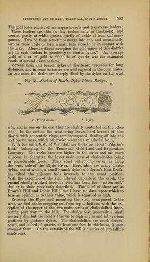 Keywords: The Quarterly journal of the Geological Society of London (13889884388).jpg LTDENBUEG AXD DE KAAP TRANSVAAL SOUTH APRICA <br> 583 <br> The gold lodes consist of main qnartz-reefs and transverse leaders ; <br> These leaders are thin a few inches onlj- in thickness and <br> consist partly of white quartz partly of oxide of iron and man- <br> ganese Two of them sometimes merge into one and occasionally <br> two or more unite to form a main lode close to or in contact with <br> the dyke Almost without exception the gold-mines of this district <br> are in such leaders in proximity to diorite dykes An average <br> yield of 4 oz of gold to 2000 lb of quartz was the estimated <br> result of several examinations <br> Several main and branch dykes of diorite are traceable for long <br> distances and in some instances are well exposed in the open mines <br> In two cases the shales are sharply tilted by the dykes on the west <br> w <br> Fig 3 ” Section of Diorite Dyhe Lishon-Berlyn <br> E <br> a Tilted shale <br> b Dyke <br> side and in one on the east they are slightly contorted on the other <br> side In the section the weathering leaves hard kernels of blue <br> diorite with concentric rings semidecomposed shading off into the <br> soft brown mass which otherwise resembles an alluvial loam <br> v A few miles S W of Waterfall are the farms about Pilgrim's <br> Rest belonging to the Transvaal Gold-Land-and-Exploration <br> Company The rocks here are higher in the series and are more <br> siliceous in character the lower main mass of chalcedolites being <br> in considerable force Their chief outcrop however is along <br> the west side of the Blyde Eiver Here also are many diorite <br> dykes one of which a small branch dj'ke in Pilgrim's-Eest Creek <br> has tilted the adjacent beds inversely to the usual position <br> With the exception of the rich alluvial deposits in the creek the <br> ground chiefly worked here for gold has been the rotten-reef <br> similar to those previously described The chief of these are at <br> Erown's Hill and Ophir Hill ; but I have no data upon which to <br> base an opinion as to their value which is regarded as high <br> Crossing the Blyde and mounting the steep escarpment to the <br> west we find shales cropping out from top to bottom with the ex- <br> ception of the upper of the two main series of chalcedolites inter- <br> vening part way up the hill The shales have generally a small <br> westerly dip but are locally thrown to high angles and into various <br> positions by plutonic dykes The chalcedolites are much decom- <br> posed and a bed of quartz at least one foot in thickness is seen <br> amongst them On the summit of the hill is a series of crystalline <br> sandstones 37047463 114009 51125 Page 583 Text 41 http //www biodiversitylibrary org/page/37047463 1885 Geological Society of London Biodiversity Heritage Library The Quarterly journal of the Geological Society of London v 41 1885 Geology Periodicals Smithsonian Libraries bhl page 37047463 dc identifier http //biodiversitylibrary org/page/37047463 smithsonian libraries Information field Flickr posted date ISOdate 2014-04-30 Check categories 2015 August 26 CC-BY-2 0 BioDivLibrary https //flickr com/photos/61021753 N02/13889884388 2015-08-26 04 58 59 cc-by-2 0 PD-old-70-1923 The Quarterly journal of the Geological Society of London 1885 Photos uploaded from Flickr by Fæ using a script |