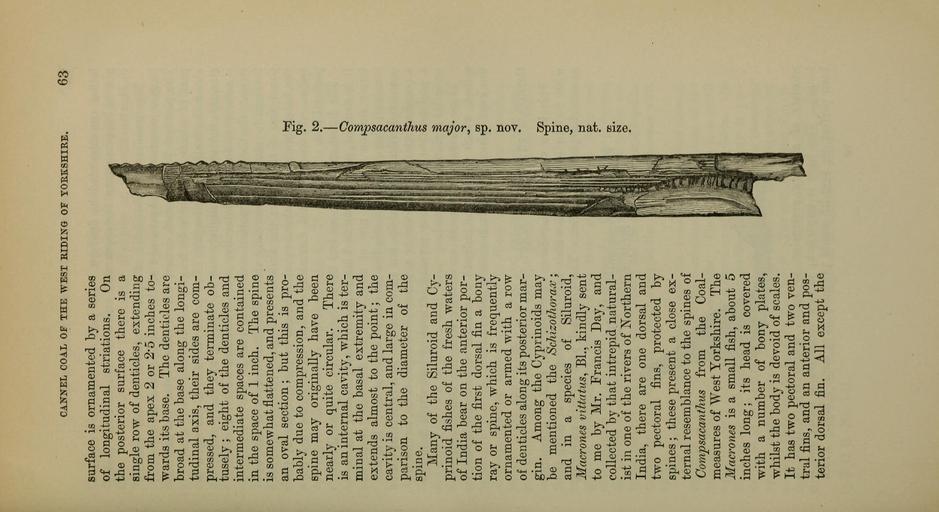 | Keywords: The Quarterly journal of the Geological Society of London (12960135993).jpg CANCEL COAL OF THE WEST EIDI s G OP YOBKSHIBE <br> 63 <br> surface is ornamented by a series <br> of longitudinal striations On <br> the posterior surface there is a <br> single row of denticles extending <br> from the apex 2 or 2-5 inches to- <br> wards its base The denticles are <br> broad at the base along the longi- <br> tudinal axis their sides are com- <br> pressed and they terminate ob- <br> tusely ; eight of the denticles and <br> intermediate spaces are contained <br> in the space of 1 inch The spine <br> is somewhat flattened and presents <br> an oval section ; but this is pro- <br> bably due to compression and the <br> spine may originally have been <br> nearly or quite circular There <br> is an internal cavity which is ter- <br> minal at the basal extremity and <br> extends almost to the point ; the <br> cavity is central and large in com- <br> parison to the diameter of the <br> spine <br> Many of the Siluroid and Cy- <br> prinoid fishes of the fresh waters <br> of India bear on the anterior por- <br> tion of the first dorsal fin a bony <br> ray or spine which is frequently <br> ornamented or armed with a row <br> of denticles along its posterior mar- <br> gin Among the Cyprinoids may <br> be mentioned the Scliizotliorax ; <br> and in a species of Siluroid <br> Macrones vittatus Bl kindly sent <br> to me by Mr Francis Day and <br> collected by that intrei3id natural- <br> ist in one of the rivers of Northern <br> India there are one dorsal and <br> two pectoral fins protected by <br> sjjines ; these present a close ex- <br> ternal resemblance to the spines of <br> Compsacanthus from the Coal- <br> measures of West Yorkshire The <br> Macrones is a small fish about 5 <br> inches long ; its head is covered <br> with a number of bony plates <br> whilst the body is devoid of scales <br> It has two pectoral and two ven- <br> tral fins and an anterior and pos- <br> terior dorsal fin All except the <br> to <br> g <br> 2 <br> 36090398 111264 51125 Page 63 Text 36 http //www biodiversitylibrary org/page/36090398 1880 Geological Society of London NameFound Compsacanthus NameConfirmed Compsacanthus NameBankID 4122934 NameFound Macrones NameConfirmed Macrones EOLID 13213 NameBankID 177531 NameFound Macrones vittatus NameConfirmed Macrones vittatus Bloch 1794 EOLID 219251 NameBankID 160448 Biodiversity Heritage Library The Quarterly journal of the Geological Society of London v 36 1880 Geology Periodicals Smithsonian Libraries bhl page 36090398 dc identifier http //biodiversitylibrary org/page/36090398 smithsonian libraries Information field Flickr posted date ISOdate 2014-03-06 Check categories 2015 August 26 CC-BY-2 0 BioDivLibrary https //flickr com/photos/61021753 N02/12960135993 2015-08-26 16 54 04 cc-by-2 0 PD-old-70-1923 The Quarterly journal of the Geological Society of London 1880 Photos uploaded from Flickr by Fæ using a script |