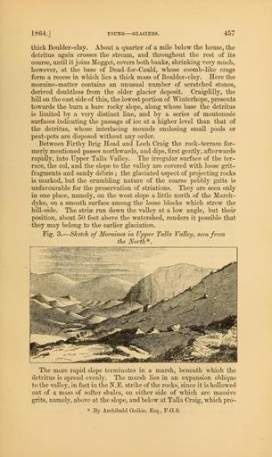 Keywords: The Quarterly journal of the Geological Society of London (12895160303).jpg 1864 <br> YOUNG GLACIERS <br> 45 <br> thick Boulder-clay About a quarter of a mile below the house the <br> detritus again crosses the stream and throughout the rest of its <br> course until it joins Megget covers both banks shrinking very much <br> however at the base of Dead- for-Cauld whose coomb-like crags <br> form a recess in which lies a thick mass of Boulder-clay Here the <br> moraine-matter contains an unusual number of scratched stones <br> derived doubtless from the older glacier deposit Craigdilly the <br> hill on the east side of this the lowest portion of Winterhope presents <br> towards the burn a bare rocky slope along whose base the detritus <br> is limited by a very distinct line and by a series of moutonnee <br> surfaces indicating the passage of ice at a higher level than that of <br> the detritus whose interlacing mounds enclosing small pools or <br> peat-pots are disposed without any order <br> Between Firthy Brig Head and Loch Craig the rock-terrace for- <br> merly mentioned passes northwards and dips first gently afterwards <br> rapidly into Upper Talla Valley The irregular surface of the ter- <br> race the col and the slope to the valley are covered with loose grit- <br> fragments and sandy debris ; the glaciated aspect of projecting rocks <br> is marked but the crumbling nature of the coarse pebbly grits is <br> unfavourable for the preservation of striations They are seen only <br> in one place namely on the west slope a little north of the March- <br> dyke on a smooth surface among the loose blocks which strew the <br> hill-side The striae run down the valley at a low angle but their <br> position about 50 feet above the watershed renders it possible that <br> they may belong to the earlier glaciation <br> Fig 3 ” Sketch of Moraines in Upper Talla Valley seen from <br> the North <br> The more rapid slope terminates in a marsh beneath which the <br> detritus is spread evenly The marsh lies in an expansion oblique <br> to the valley in fact in the N E strike of the rocks since it is hollowed <br> out of a mass of softer shales on either side of which are massive <br> grits namely abovo at the slope and below at Talla Craig which pro- <br> By Archibald Geikie Esq F G- S 36089726 111261 51125 Page 457 Text v 20 http //www biodiversitylibrary org/page/36089726 1864 Geological Society of London Biodiversity Heritage Library The Quarterly journal of the Geological Society of London v 20 1864 Geology Periodicals Smithsonian Libraries bhl page 36089726 dc identifier http //biodiversitylibrary org/page/36089726 smithsonian libraries Information field Flickr posted date ISOdate 2014-03-03 Check categories 2015 August 26 CC-BY-2 0 BioDivLibrary https //flickr com/photos/61021753 N02/12895160303 2015-08-26 16 54 57 cc-by-2 0 PD-old-70-1923 The Quarterly journal of the Geological Society of London 1864 Photos uploaded from Flickr by Fæ using a script |