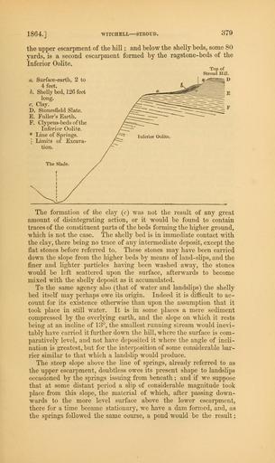 Keywords: The Quarterly journal of the Geological Society of London (12895114593).jpg 1864 <br> WITCHELL STROUD <br> 379 <br> the upper escarpment of the hill ; and below the shelly beds some 80 <br> yards is a second escarpment formed by the ragstone-beds of the <br> Inferior Oolite <br> Top of <br> Stroud Hill <br> a Surface-earth 2 to <br> 4 feet <br> b Shelly bed 126 feet <br> long <br> c Clay <br> D Stonesfield Slate <br> E Fuller's Earth <br> F Clypeus-beds of the <br> Inferior Oolite <br> Line of Springs <br> Limits of Excava- <br> tion <br> The formation of the clay c was not the result of any great <br> amount of disintegrating action or it would be found to contain <br> traces of the constituent parts of the beds forming the higher ground <br> which is not the case The shelly bed is in immediate contact with <br> the clay there being no trace of any intermediate deposit except the <br> flat stones before referred to These stones may have been carried <br> down the slope from the higher beds by means of land-slips and the <br> finer and lighter particles having been washed away the stones <br> would be left scattered upon the surface afterwards to become <br> mixed with the shelly deposit as it accumulated <br> To the same agency also that of water and landslips the shelly <br> bed itself may perhaps owe its origin Indeed it is difficult to ac- <br> count for its existence otherwise than upon the assumption that it <br> took place in still water It is in some places a mere sediment <br> compressed by the overlying earth and the slope on which it rests <br> being at an incline of 13° the smallest running stream would inevi- <br> tably have carried it further down the hill where the surface is com- <br> paratively level and not have deposited it where the angle of incli- <br> nation is greatest but for the interposition of some considerable bar- <br> rier similar to that which a landslip would produce <br> The steep slope above the line of springs already referred to as <br> the upper escarpment doubtless owes its present shape to landslips <br> occasioned by the springs issuing from beneath ; and if we suppose <br> that at some distant period a slip of considerable magnitude took <br> place from this slope the material of which after passing down- <br> wards to the more level surface above the lower escarpment <br> there for a time became stationary we have a dam formed and as <br> the springs followed the same course a pond would be the result ; 36089644 111261 51125 Page 379 Text v 20 http //www biodiversitylibrary org/page/36089644 1864 Geological Society of London Biodiversity Heritage Library The Quarterly journal of the Geological Society of London v 20 1864 Geology Periodicals Smithsonian Libraries bhl page 36089644 dc identifier http //biodiversitylibrary org/page/36089644 smithsonian libraries Information field Flickr posted date ISOdate 2014-03-03 Check categories 2015 August 26 CC-BY-2 0 BioDivLibrary https //flickr com/photos/61021753 N02/12895114593 2015-08-26 16 56 03 cc-by-2 0 PD-old-70-1923 The Quarterly journal of the Geological Society of London 1864 Photos uploaded from Flickr by Fæ using a script |