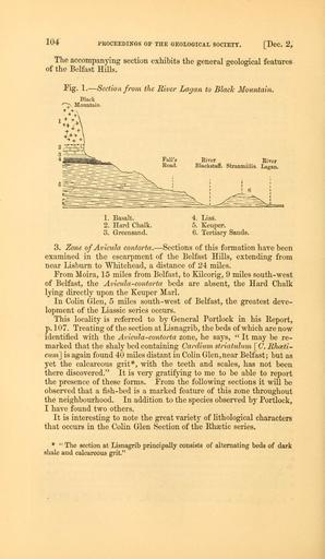 | Keywords: The Quarterly journal of the Geological Society of London (12894937733).jpg 104 PROCEEDINGS OF THE GEOLOGICAL SOCIETY Dec 2 <br> The accompanying section exhibits the general geological features <br> of the Belfast Hills <br> Fig 1 ” Section from the River Lagan to Black Mountain <br> Black <br> Mountain <br> Fall' <br> Road <br> River River <br> Blackstafr Stranmillis Lagan <br> 5 <br> 1 Basalt <br> 2 Hard Chalk <br> 3 Greensand <br> 4 Lias <br> 5 Keupen <br> 6 Tertiary Sands <br> 3 Zone ofAvicula contorta ” Sections of this formation have been <br> examined in the escarpment of the Belfast Hills extending from <br> near Lisburn to Whitehead a distance of 24 miles <br> From Moira 15 miles from Belfast to Kilcorig 9 miles south-west <br> of Belfast the Avicula-contorta beds are absent the Hard Chalk <br> lying directly upon the Keuper Marl <br> In Colin Glen 5 miles south-west of Belfast the greatest deve- <br> lopment of the Liassic series occurs <br> This locality is referred to by General Portlock in his Report <br> p 107 Treating of the section at Lisnagrib the beds of which are now <br> identified with the Avicula-contorta zone he says It may be re- <br> marked that the shaly bed containing Carclium strialulum C Hhosti- <br> cum is again found 40 miles distant in Colin Glen near Belfast; but as <br> yet the calcareous grit with the teeth and scales has not been <br> there discovered It is very gratifying to me to be able to report <br> the presence of these forms Prom the following sections it will be <br> observed that a fish-bed is a marked feature of this zone throughout <br> the neighbourhood In addition to the species observed by Portlock <br> I have found two others <br> It is interesting to note the great variety of lithological characters <br> that occurs in the Colin Glen Section of the Rhsetic series <br> The section at Lisnagrib principally consists of alternating beds of dark <br> shale and calcareous grit 36089345 111261 51125 Page 104 Text v 20 http //www biodiversitylibrary org/page/36089345 1864 Geological Society of London Biodiversity Heritage Library The Quarterly journal of the Geological Society of London v 20 1864 Geology Periodicals Smithsonian Libraries bhl page 36089345 dc identifier http //biodiversitylibrary org/page/36089345 smithsonian libraries Information field Flickr posted date ISOdate 2014-03-03 Check categories 2015 August 26 CC-BY-2 0 BioDivLibrary https //flickr com/photos/61021753 N02/12894937733 2015-08-26 16 58 33 cc-by-2 0 PD-old-70-1923 The Quarterly journal of the Geological Society of London 1864 Photos uploaded from Flickr by Fæ using a script |