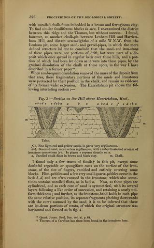 Keywords: The Quarterly journal of the Geological Society of London (12826412333).jpg 326 <br> PROCEEDINGS OF THE GEOLOGICAL SOCIETY <br> with unrolled chalk-flints imbedded in a brown and ferruginous clay <br> To find similar fossiliferous blocks in situ I re-examined the district <br> between this ridge and the Thames but without success I found <br> however at another chalk-pit between Lenham Hill and Harriets- <br> ham Hill and distant seven-eighths of a mile W N W from the <br> Lenham pit some larger sand- and gravel-pipes in which the more <br> defined structure led me to conclude that the sand- and iron-stone <br> of these pipes were not portions of drift but were part of a de- <br> posit which once spread in regular beds over these hills and a por- <br> tion of which had been let down as it were into these pipes by the <br> gradual dissolution of the chalk at these spots in the way I have <br> described in a former paper <br> When a subsequent denudation removed the mass of the deposit from <br> that area these fragmentary portions of the sands and ironstones <br> were protected by their position in the chalk and remain as evidence <br> of its former wider extension The Harrietsham pit shows the fol- <br> lowing interesting section ” <br> Fig 3 ” Section on the Hill above Harrietsham Kent <br> abode edcba a b a a bed e f e deba <br> x7 I – » \ r v 7 <br> X ' r Km ' <br> Talus <br> f e Fine light-red and yellow sands in parts very argillaceous <br> d-b Greenish sand more or less argillaceous with a subordinate bed or seam of <br> ironstone concretions e In places c reposes directly on a <br> a Unrolled chalk-flints in brown and black clay m Chalk <br> I found only a few traces of fossils f in this pit except some <br> doubtful vegetable or spongiform casts on the surface of the iron- <br> stone of the size of fingers ramified and entirely covering some <br> blocks Flint-pebbles and a few very small quartz-pebbles occur in the <br> beds b-d and are often encased in the ironstone which also some- <br> times contains unrolled flints as in bed a Now as these pipes are <br> cylindrical and as each core of sand is symmetrical with its several <br> layers following a like order of succession and retaining a nearly uni- <br> form thickness ; and further as the ironstone-band holds in each pipe <br> the same relative position its separate fragments pitching downwards <br> with the curve assumed by the sand it is to be inferred that these <br> are let-down portions of strata of which the original structure was <br> horizontal and formed as in fig 4 <br> Quart Journ Geol Soc vol xi p 64 <br> f The cast of a Cardium has since been found in the ironstone here 36214300 111684 51125 Page 326 Text v 14 http //www biodiversitylibrary org/page/36214300 1858 Geological Society of London NameFound Cardium NameConfirmed Cardium EOLID 50301 NameBankID 2693257 Biodiversity Heritage Library The Quarterly journal of the Geological Society of London v 14 1858 Geology Periodicals Smithsonian Libraries bhl page 36214300 dc identifier http //biodiversitylibrary org/page/36214300 smithsonian libraries Information field Flickr posted date ISOdate 2014-02-28 Check categories 2015 August 26 CC-BY-2 0 BioDivLibrary https //flickr com/photos/61021753 N02/12826412333 2015-08-26 17 52 36 cc-by-2 0 PD-old-70-1923 The Quarterly journal of the Geological Society of London 1858 Photos uploaded from Flickr by Fæ using a script |