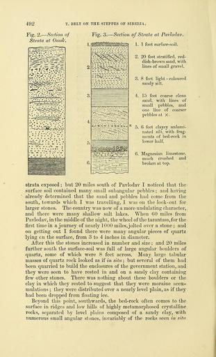| Keywords: The Quarterly journal of the Geological Society of London (12734411654).jpg T BELT ON THE STEPPES OE SIBERIA <br> 493 <br> in the immediate neighbourhood ; the <br> fragments distributed over the plains <br> were entirely unworn Where ex- <br> cavations had been made they were <br> seen to be much more numerous on <br> the surface than below The ridges <br> and hills were covered with shattered <br> fragments of the rocks of which they <br> were composed ; nowhere were there <br> any signs that they had ever suppor- <br> ted glaciers though probably they <br> had been exposed to the action of <br> intense frost If we suppose that the <br> plains had been covered with water <br> forming shallow lakes the distribu- <br> tion of the angular fragments over <br> their surface can be easily accounted <br> for as these lakes would be frozen <br> over in winter and on the ice break- <br> ing up in the spring it would carry <br> away fragments of rocks from the <br> surrounding ridges and drop them in <br> various parts of the lakes I have <br> reason to believe this cause sufficient <br> as I have seen it in operation in the <br> lakes of North America and described <br> it in a paper read before this Society <br> in 1864 <br> The country beyond this to the <br> southward although still called the <br> Kirghese steppes had lost its level <br> character and some of the ridges of <br> crystalline rocks rose to heights of at <br> least 2000 feet none of which showed <br> any signs of glaciation excepting that <br> the surface had been shattered by <br> intense frost The true plains may <br> be said to end on this meridian about <br> lat 51° N ; whilst to the north-east <br> they extend diagonally across Siberia <br> for 3000 miles Over this enormous <br> range of country their internal con- <br> stitution seems to be the same as that <br> of the plains I traversed ; at Sama- <br> rova however on the same meridian <br> as Ischim but 345 miles further north <br> Erman states that the yellow talcose <br> clay of which the plains consist rests <br> on another filled with large fragments <br> of rock and says it must be assumed <br> Ol – <br> Aj <br> ” e <br> ' – ';;-; v 35766414 110599 51125 Page 492 Text v 30 http //www biodiversitylibrary org/page/35766414 1874 Geological Society of London Biodiversity Heritage Library The Quarterly journal of the Geological Society of London v 30 1874 Geology Periodicals Smithsonian Libraries bhl page 35766414 dc identifier http //biodiversitylibrary org/page/35766414 smithsonian libraries Information field Flickr posted date ISOdate 2014-02-24 Check categories 2015 August 26 CC-BY-2 0 BioDivLibrary https //flickr com/photos/61021753 N02/12734411654 2015-08-26 20 03 50 cc-by-2 0 PD-old-70-1923 The Quarterly journal of the Geological Society of London 1874 Photos uploaded from Flickr by Fæ using a script |