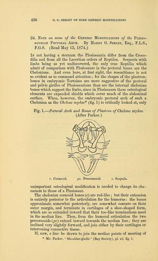 | Keywords: The Quarterly journal of the Geological Society of London (12734064723).jpg OF THE PLESIOSAUEIAN PECTOKAX AECH 437 <br> the precoracoids and coracoids and a thin film of ossified connective <br> tissue extend over the interspace between them and unite these <br> bones respectively on each side of the animal a pair of coracoid <br> bones will be constituted similar in form position and relation to <br> those which characterize the Plesiosauria the only difference being <br> that in Plesiosaurs the precoracoid is connate with the coracoid as <br> in the Ostrich and many Lizards ; while in Chelonians it is connate <br> with the scapula s but much importance cannot be attached to the <br> condition of the precoracoid since no one will contend that Plesio- <br> saurs are either Lizards or Tortoises ; while among Amphibians the <br> precoracoid is a distinct bone so placed that it might combine indif- <br> ferently with coracoid or scapula <br> It is a noteworthy fact familiar to all who collect Plesiosaurian <br> coracoids from soft strata that the whole of this triangular inter- <br> space between the precoracoid and coracoid parts which I covered <br> in the Turtle with an imaginary thin ossification is liable to be <br> broken away in extricating the fossil ; and then there remains only <br> a curious bone forked from the humeral articular surface which <br> closely resembles the precoraco-coracoid portion of the chelonian <br> pectoral arch just described and in which only the precoracoid parts <br> similarly meet each other in the median line A beautiful example <br> of such a specimen from the Kimmeridge Clay presented by J C <br> Mansell-Pleydell Esq is exhibited in the British Museum fig 2 <br> Fig 2 ” Coracoids of Hurgenosanrus <br> Showing connation of coracoid c and precoracoid pc <br> Such a specimen goes far to justify an interpretation of the Plesio- <br> saurian coracoids as the combined coracoid and precoracoid bones <br> The Chelonian however has the form of its pectoral and pelvic <br> arches modified by the enormous amount of potential epiphysial <br> ossification which characterizes the subclass The epipleural carti- <br> lages of the Crocodile and the small epipleural bones of Hatteria <br> and of Birds are among Chelonians changed by potential growth <br> into ossifications in comparison with which the original pleural ele- <br> ments are small ; while they so grow and unite that an epipleural <br> skeleton is formed encased not in muscles as in most other ani- <br> mals but in representatives of muscles now converted in most <br> Chelonians into horny scutes corresponding with muscles in their <br> extension <br> It is at present standing over the remains of Megalosaurus without osteo- <br> logical determination and is placed upside down 35766358 110599 51125 Page 436 Text v 30 http //www biodiversitylibrary org/page/35766358 1874 Geological Society of London NameFound Hatteria NameConfirmed Hatteria NameBankID 211227 NameFound Megalosaurus NameConfirmed Megalosaurus EOLID 13154127 NameBankID 4234935 Biodiversity Heritage Library The Quarterly journal of the Geological Society of London v 30 1874 Geology Periodicals Smithsonian Libraries bhl page 35766358 dc identifier http //biodiversitylibrary org/page/35766358 smithsonian libraries Information field Flickr posted date ISOdate 2014-02-24 Check categories 2015 August 26 CC-BY-2 0 BioDivLibrary https //flickr com/photos/61021753 N02/12734064723 2015-08-26 19 57 30 cc-by-2 0 PD-old-70-1923 The Quarterly journal of the Geological Society of London 1874 Photos uploaded from Flickr by Fæ using a script |