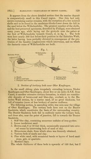 Keywords: The Quarterly journal of the Geological Society of London (12711568133).jpg 1855 HAMILTON TERTIARIES OF HESSE CASSEL <br> 129 <br> It appears from the above detailed section that the marine deposit <br> is comparatively small in this Cassel region One thin bed only <br> occurs containing marine remains with the exception of a few isolated <br> shells said to be found in the sandstone-blocks lower down the hill in <br> the sand below the Wilhelmshohe The greatest number of the shells <br> and the best preserved specimens described by Philippi were obtained <br> many years ago while laying out the grounds near the palace at <br> the foot of Wilhelmshohe towards Cassel d in fig 1 The beds <br> were here nearly 300 feet below their position in the Habichts Wald <br> the latter having been probably elevated in consequence of the pro- <br> trusion of the basaltic conglomerate which intervenes and on which <br> the fantastic ruins of Wilhelmshohe are built <br> Habichts Wald <br> Fie L <br> a Basalt <br> b Brown-coal beds <br> c Trachytic and basaltic conglomerate <br> Cassel <br> <br> d Tertiary beds <br> e Muschelkalk <br> 2 Section of tertiary beds near Ober Kavfungen <br> In the small oblong plain irregularly extending between Nieder <br> Kaufungen and Ober Kaufungen about five or six miles E S E from <br> Cassel is another extensive tertiary formation in which are consider- <br> able deposits of brown-coal and blue-clay overlaid as in the Ha- <br> bichts Wald section by a marine sand of no great thickness but <br> full of remains more or less broken of marine moUusca <br> The following section in ascending order was seen near the village <br> of Ober Kaufungen The tertiary beds here rest on the Bunter <br> Sandstein which constitutes the basis of the surrounding country <br> The Bunter Sandstein beds fall in suddenly under the tertiary beds <br> and these also near the point of junction fall in towards the Bunter <br> Sandstein <br> 1 Stiif blue clay containing numerous nodules of iron-pyrites <br> 2 Loose incoherent sand <br> 3 Brown-coal 8 or 10 feet thick occasionally separated into seve- <br> ral seams by intervening beds of sand or clay <br> 4 Bituminous shale from which alum was formerly obtained <br> 5 Various beds of marls and clay <br> 6 Fine white sand with occasional bands or layers of hard sand- <br> stone grit or quartzite <br> 7 Mottled clays <br> The whole thickness of these beds is upwards of 1 00 feet but I 35614701 110213 51125 Page 129 Text v 11 http //www biodiversitylibrary org/page/35614701 1855 Geological Society of London Biodiversity Heritage Library The Quarterly journal of the Geological Society of London v 11 1855 Geology Periodicals Smithsonian Libraries bhl page 35614701 dc identifier http //biodiversitylibrary org/page/35614701 smithsonian libraries Information field Flickr posted date ISOdate 2014-02-23 Check categories 2015 August 26 CC-BY-2 0 BioDivLibrary https //flickr com/photos/61021753 N02/12711568133 2015-08-26 21 00 46 cc-by-2 0 PD-old-70-1923 The Quarterly journal of the Geological Society of London 1855 Photos uploaded from Flickr by FĂŚ using a script |