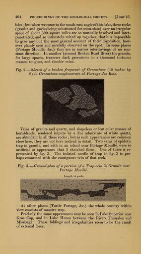 | Keywords: The Quarterly journal of the Geological Society of London (12684381315).jpg 404 <br> PROCEEDINGS OF THE GEOLOGICAL SOCIETY June 1 6 <br> isles ; but when we come to the south-east angle of this lake these rocks <br> granite and gneiss being substituted for mica-slate over an irregular <br> space of about 300 square miles are so mutually involved and inter- <br> penetrated and so intimately mixed up together that it is impossible <br> to give any but the most general account of their disposition how- <br> ever plainly seen and carefully observed on the spot In some places <br> Portage Mouille c they are in narrow interleavings of no con- <br> stant direction In another around Broken Road River the granite <br> for large spaces traverses dark greenstone in a thousand tortuous <br> masses tongues and slender veins <br> Fig 2 ” Sketch of a broken fragment of Greenstone 18 inches hy <br> 8 in Greenstone-conglomerate at Portage des Bois <br> Veins of granite and quartz and shapeless or lenticular masses of <br> hornblende rendered impure by a fine admixture of white quartz <br> are abundant in all these rocks ; but as such appearances are common <br> elsewhere they are not here noticed in detail Two veins of epidotic <br> trap in granite met with in an island near Portage Mouille were so <br> artificial in appearance that I sketched them One of these is re- <br> presented by fig 3 The isolated needle of trap in fig 3 is per- <br> haps connected with the contiguous vein of that rock <br> Fig 3 ” Ground-plan of a portion of a Trap-vein in Granite near <br> Portage Mouille <br> Length 10 yards <br> At other places Turtle Portage c the whole country within <br> view consists of massive trap <br> Precisely the same appearances may be seen in Lake Superior near <br> Gros Cap and in Lake Huron between the Rivers Thessalon and <br> Missisaga These foldings and irregularities seem to be the result <br> of external force 35461478 109911 51125 Page 404 Text v 8 http //www biodiversitylibrary org/page/35461478 1852 Geological Society of London Biodiversity Heritage Library The Quarterly journal of the Geological Society of London v 8 1852 Geology Periodicals Smithsonian Libraries bhl page 35461478 dc identifier http //biodiversitylibrary org/page/35461478 smithsonian libraries Information field Flickr posted date ISOdate 2014-02-21 Check categories 2015 August 26 CC-BY-2 0 BioDivLibrary https //flickr com/photos/61021753 N02/12684381315 2015-08-26 20 51 52 cc-by-2 0 PD-old-70-1923 The Quarterly journal of the Geological Society of London 1852 Photos uploaded from Flickr by Fæ using a script |