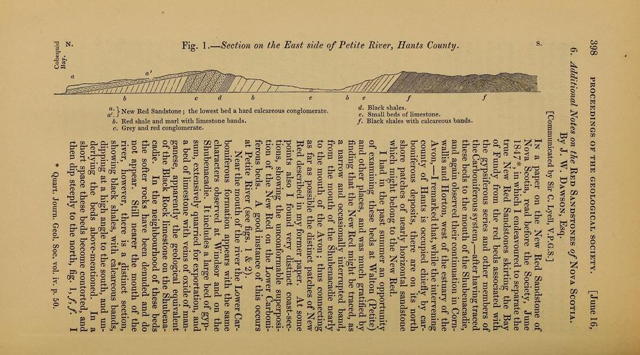 Keywords: The Quarterly journal of the Geological Society of London (12684359115).jpg 398 <br> PROCEEDINGS OF THE GEOLOGICAL SOCIETY June 16 <br> 6 Additional Notes on the Red Sandstones q/ Nova Scotia <br> By J W Dawson Esq <br> Communicated by Sir C Lyell V P G S <br> ' ' In a paper on the New Red Sandstone of <br> Nova Scotia read before the Society June <br> 1 84 7 in which I endeavoured to separate the <br> / true New Red Sandstones skirting the Bay <br> \ of Fundy from the red beds associated with <br> the gypsiferous series and other members of <br> the Carboniferous system ” after having traced <br> 'I these beds to the mouth of the Shubenacadie <br> -J and again observed their continuation in Corn- <br> § wallis and Horton west of the estuary of the <br> I ' Avon ” I remarked that while the intervening <br> I o county of Hants is occupied chiefly by car- <br> ¢ boniferous deposits there are on its north <br> S ° 23 shore patches of nearly horizontal sandstone <br> i which might belong to the New Red <br> -g rM I had in the past summer an opportunity <br> S 1 1 of examining these beds at Walton Petite <br> ¢Â« and other places and was much gratified by <br> finding that the New Red might be traced as <br> a narrow and occasionally interrupted band <br> from the mouth of the Shubenacadie nearly <br> I to the mouth of the Avon ; thus connecting <br> I as far as possible the distinct patches of New <br> 'W3 Red described in my former paper At some <br> 8 points also I found very distinct coast-sec- <br> 1 tions showing the unconformable superposi- <br> I tion of the New Red on the Lower Carboni- <br> ferous beds A good instance of this occurs <br> I at Petite River see figs 1 2 <br> rt Near the mouth of the river the Lower Car- <br> 's - boniferous formation appears with the same <br> I characters observed at Windsor and on the <br> I I Shubenacadie It includes a large bed of gyp- <br> 2 1 sum extensively quarried for exportation and <br> tl 1 1 a bed of limestone with veins of oxide of man- <br> I g-i ganese apparently the geological equivalent <br> 1 J 8 of the Black Rock limestone on the Shubena- <br> tg § g cadie In the neighbourhood of these beds <br> I ll the softer rocks have been denuded and do <br> Z appear Still nearer the mouth of the <br> «o river however there is a distinct section <br> J - J « showing black shales with calcareous bands <br> dipping at a high angle to the south and un- <br> derlying the beds above-mentioned In a <br> short space these beds become contorted and <br> then dip steeply to the north fig \ f f I <br> Quart Journ Geol Soc vol iv p 50 35461468 109911 51125 Page 398 Text v 8 http //www biodiversitylibrary org/page/35461468 1852 Geological Society of London Biodiversity Heritage Library The Quarterly journal of the Geological Society of London v 8 1852 Geology Periodicals Smithsonian Libraries bhl page 35461468 dc identifier http //biodiversitylibrary org/page/35461468 smithsonian libraries Information field Flickr posted date ISOdate 2014-02-21 Check categories 2015 August 26 CC-BY-2 0 BioDivLibrary https //flickr com/photos/61021753 N02/12684359115 2015-08-26 20 58 48 cc-by-2 0 PD-old-70-1923 The Quarterly journal of the Geological Society of London 1852 Photos uploaded from Flickr by Fæ using a script |