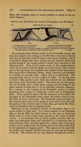 | Keywords: The Quarterly journal of the Geological Society of London (12684744794).jpg 276 PROCEEDINGS OF THE GEOLOGICAL SOCIETY May 19 <br> flints with irregular seams of eocene pebbles as shown in the an- <br> nexed diagram <br> Section near Portobello Inn between Farningham and Wrotham <br> N Scale 12 feet to 1 inch S <br> Talus Talus <br> a Dark ferruginous clay with flints c Seams of rounded Eocene pebbles <br> b b' Light-coloured sandy loam d Red and yellow ochraceous sand <br> e Clay sandy loam and Eocene pebbles in irregular alternations horizontally stratified ; <br> becoming obscure towards the south part of the section / Chalk <br> The materials which fill the cavities in the Portobello section and <br> form the subsoil in the cuttings on the Wrotham road have evidently <br> been derived from the wreck of some of the eocene tertiaries ; but if <br> it should be alleged that these cavities and the deposits which they <br> contain belong to the eocene period I would draw attention to the <br> following facts None of the eocene strata of this neighbourhood <br> which are in contact with the chalk are of the red and yellow colours <br> seen in the specimens now exhibited and obtained from this section <br> The lowest bed at Woolwich Bexley Erith Crayford and Dartford <br> is a whitish or greenish sand Above this is a pebble-bed The <br> sand generally rests on an even surface of chalk In the few cases <br> in which it fills cavities in the chalk the contents are very diiferent <br> from those of the Portobello section The sands are not only green- <br> ish but the flints have a dark green coating and the lining of the <br> pipes instead of being clay is of an indurated ochreous character <br> As a contrast to the contents of the Portobello cavities I exhibit <br> specimens from a pipe in a chalk-pit a little east of LulHngstone <br> Park These specimens agree with the characters of the matter fill- <br> ing pipes in the Hampshire basin where the chalk is there in con- <br> tact with the lower eocene bed The Portobello sands and clays on <br> the contrary have more of the aspect of those which form the mid- <br> dle portion of the vertical strata of Alum Bay and which Mr Prest- <br> wich has identified with the Bagshot sands <br> Moreover in the immediate vicinity of Portobello there is an <br> eocene outlier of white sand In a wood marked on the Ordnance <br> Map as Knock Mill but better known on the spot as Gravel-pit <br> Wood there is a bed of this sand exposed to the depth of about <br> 12 feet A reconstructed bed of eocene pebbles unmixed with an- <br> gular and subangular flints and imbedded in a ferruginous base of <br> sand and loam abuts abruptly against the western edge of the sand <br> as far as can be judged from the obscure state of the section disturbed <br> by the operations of digging gravel The contact of the sand with <br> the chalk is not exposed ; but the rock must be very near the bottom <br> of the pit The surface-soil for some distance through the wood is 35461330 109911 51125 Page 276 Text v 8 http //www biodiversitylibrary org/page/35461330 1852 Geological Society of London NameFound None NameConfirmed None EOLID 2913255 Biodiversity Heritage Library The Quarterly journal of the Geological Society of London v 8 1852 Geology Periodicals Smithsonian Libraries bhl page 35461330 dc identifier http //biodiversitylibrary org/page/35461330 smithsonian libraries Information field Flickr posted date ISOdate 2014-02-21 Check categories 2015 August 26 CC-BY-2 0 BioDivLibrary https //flickr com/photos/61021753 N02/12684744794 2015-08-27 12 53 15 cc-by-2 0 PD-old-70-1923 The Quarterly journal of the Geological Society of London 1852 Photos uploaded from Flickr by Fæ using a script |