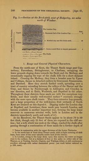 | Keywords: The Quarterly journal of the Geological Society of London (12684235975).jpg 240 PROCEEDINGS OF THE GEOLOGICAL SOCIETY Apr 21 <br> Fig 3 Section at the Brick-field west of Hedgerley six miles <br> north of Windsor <br> The London Clay <br> Feet <br> ~3 Basement-bed of the London Clay 3 <br> 4 Mottled clay and fire-brick earth 40 <br> 5 Green-coated flints in impure greensand 4 <br> The Chalk <br> 1 Range and General Physical Characters <br> From the north-east of Kent the Thanet Sands range past Can- <br> terbury Faversham Sittingbourne to Chatham occupying the <br> lower grounds sloping down towards the Swale and the Med way and <br> occasionally capping the tops of the chalk hills for a short distance <br> inland Crossing the Medway they form a broader zone by Upnor <br> and Cobham thence in detached outliers by Gravesend Swanscombe <br> and Dartford Here they stretch further south spreading over a <br> tract of country extending between the valleys of the Darent and the <br> Cray and thence by Farnborough to Addington and Croydon in <br> one direction and to Erith Woolwich and Deptford in the other <br> Throughout these districts these sands are with few exceptions very <br> fertile and their usually well-wooded surface contrasts strongly <br> with the more open chalk tracts They form extensive hop grounds <br> and a large proportion of the well-known fruit orchards of North <br> Kent are situated on this deposit f Dipping under the London clay <br> at Deptford and Lewisham these sands pass beneath London and <br> isecome available in another important way forming the large water <br> reservoir to numerous artesian wells both in London and in the <br> districts immediately north and south of it <br> At the Reculvers the Thanet Sands appear to be about 70 to SO <br> feet thick though only 25 feet of them are exposed in the cliff sec- <br> tion ; but a well which was sunk at the village reached the chalk after <br> passing through a continuation of these sands for a further depth of <br> Taken in conjunction with the upper divisions of the Lower Tertiaries <br> f In the north-east of Kent these Thanet sands with a slight covering of drift <br> loam form some of the most valuable arable land of the county <br> X In London owing to the large drain upon this source the water no longer <br> rises to the surface ; but at a distance of four or five miles on either side of the <br> Thames as at Tooting Garrett Clapton and Waltham Abbey it still continues to <br> overflow although with rather diminished power see work before referred to <br> p 238 note 35461288 109911 51125 Page 240 Text v 8 http //www biodiversitylibrary org/page/35461288 1852 Geological Society of London Biodiversity Heritage Library The Quarterly journal of the Geological Society of London v 8 1852 Geology Periodicals Smithsonian Libraries bhl page 35461288 dc identifier http //biodiversitylibrary org/page/35461288 smithsonian libraries Information field Flickr posted date ISOdate 2014-02-21 Check categories 2015 August 26 CC-BY-2 0 BioDivLibrary https //flickr com/photos/61021753 N02/12684235975 2015-08-27 12 51 37 cc-by-2 0 PD-old-70-1923 The Quarterly journal of the Geological Society of London 1852 Photos uploaded from Flickr by FĂŚ using a script |