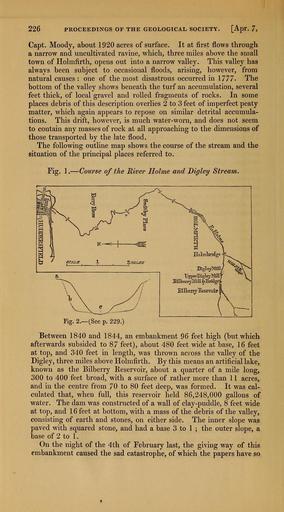 Keywords: The Quarterly journal of the Geological Society of London (12684225705).jpg overlies 2 to 3 feet of imperfect peaty <br> matter which again appears to repose on similar detrital accumula- <br> tions This drift however is much water-worn and does not seem <br> to contain any masses of rock at all approaching to the dimensions of <br> those transported by the late flood <br> The following outline map shows the course of the stream and the <br> situation of the principal places referred to <br> Fig I ” Course of the River Holme and Bigley Stream <br> Fig 2 ” See p 229 <br> Between 1840 and 1844 an embankment 9Q feet high but which <br> afterwards subsided to 87 feet about 480 feet wide at base 16 feet <br> at top and 340 feet in length was thrown across the valley of the <br> Digley three miles above Holmfirth By this means an artificial lake <br> known as the Bilberry Reservoir about a quarter of a mile long <br> 300 to 400 feet broad with a surface of rather more than 1 1 acres <br> and in the centre from 70 to 80 feet deep was formed It was cal- <br> culated that when full this reservoir held 86 248 000 gallons of <br> water The dam was constructed of a wall of clay-puddle 8 feet wide <br> at top and 16 feet at bottom with a mass of the debris of the valley <br> consisting of earth and stones on either side The inner slope was <br> paved with squared stone and had a base 3 to 1 ; the outer slope a <br> base of 2 to 1 <br> On the night of the 4th of February last the giving way of this <br> embankment caused the sad catastrophe of which the papers have so 35461274 109911 51125 Page 226 Text v 8 http //www biodiversitylibrary org/page/35461274 1852 Geological Society of London Biodiversity Heritage Library The Quarterly journal of the Geological Society of London v 8 1852 Geology Periodicals Smithsonian Libraries bhl page 35461274 dc identifier http //biodiversitylibrary org/page/35461274 smithsonian libraries Information field Flickr posted date ISOdate 2014-02-21 Check categories 2015 August 26 CC-BY-2 0 BioDivLibrary https //flickr com/photos/61021753 N02/12684225705 2015-08-27 12 57 18 cc-by-2 0 PD-old-70-1923 The Quarterly journal of the Geological Society of London 1852 Photos uploaded from Flickr by Fæ using a script |