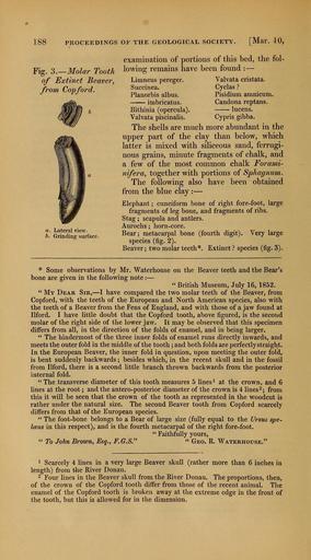 | Keywords: The Quarterly journal of the Geological Society of London (12684160935).jpg 188 <br> PROCEEDINGS OF THE GEOLOGICAL SOCIETY Mar 10 <br> Fig 3 Molar Tooth <br> of Extinct Beaver <br> from Copford <br> Lateral view <br> Grinding surface <br> examination of portions of this bed the fol- <br> lowing remains have been found <br> Limneus pereger Valvata cristata <br> Succinea Cyclas ' <br> Planorbis albus Pisidium amnicum <br> imbricatus Candona reptans <br> Bithinia opercula lucens <br> Valvata piscinalis Cypris gibba <br> The shells are much more abundant in the <br> upper part of the clay than below which <br> latter is mixed with siliceous sand ferrugi- <br> nous grains minute fragments of chalk and <br> a few of the most common chalk Forami- <br> nifera together with portions of Sphagnum <br> The following also have been obtained <br> from the blue clay <br> Elephant ; cuneiform bone of right fore-foot large <br> fragments of leg bone and fragments of ribs <br> Stag ; scapula and antlers <br> Aurochs ; horn-core <br> Bear; metacarpal bone fourth digit Very large <br> species fig 2 <br> Beaver ; two molar teeth Extinct species fig 3 <br> Some observations by Mr Waterhouse on the Beaver teeth and the Bear's <br> bone are given in the following note <br> British Museum July 16 1852 <br> My Dear Sir I have compared the two molar teeth of the Beaver from <br> Copford with the teeth of the European and North American species also with <br> the teeth of a Beaver from the Fens of England and with those of a jaw found at <br> Ilford I have little doubt that the Copford tooth above figured is the second <br> molar of the right side of the lower jaw It may be observed that this specimen <br> differs from all in the direction of the folds of enamel and in being larger <br> ' The hindermost of the three inner folds of enamel runs directly inwards and <br> meets the outer fold in the middle of the tooth ; and both folds are perfectly straight <br> In the European Beaver the inner fold in question upon meeting the outer fold <br> is bent suddenly backwards ; besides which in the recent skull and in the fossil <br> from Ilford there is a second little branch thrown backwards from the posterior <br> internal fold <br> The transverse diameter of this tooth measures 5 lines at the crown and 6 <br> hues at the root ; and the antero-posterior diameter of the crown is 4 lines 2; from <br> this it will be seen that the crown of the tooth as represented in the woodcut is <br> rather under the natural size The second Beaver tooth from Copford scarcely <br> differs from that of the European species <br> The foot-bone belongs to a Bear of large size fully equal to the Ursus spe- <br> IcBus in this respect and is the fourth metacarpal of the right fore-foot <br> Faithfully yours <br> To John Browny Esq F G S Geo R Waterhouse <br> 1 Scarcely 4 lines in a very large Beaver skull rather more than 6 inches in <br> length from the River Donau <br> 2 Four lines in the Beaver skull from the River Donau The proportions then <br> of the crown of the Copford tooth differ from those of the recent animal The <br> enamel of the Copford tooth is broken away at the extreme edge in the front of <br> the tooth but this is allowed for in the dimension 35461194 109911 51125 Page 188 Text v 8 http //www biodiversitylibrary org/page/35461194 1852 Geological Society of London NameFound Bithinia NameConfirmed Bithinia NameBankID 4091121 NameFound Candona reptans NameConfirmed Candona reptans NameBankID 6813656 NameFound Cyclas NameConfirmed Cyclas EOLID 13750058 NameBankID 4131942 NameFound Cypris gibba NameConfirmed Cypris gibba Ramdohr 1808 EOLID 339337 NameBankID 641104 NameFound Limneus pereger NameFound Pisidium amnicum NameConfirmed Pisidium amnicum EOLID 395905 NameBankID 2693600 NameFound Planorbis albus NameConfirmed Planorbis albus NameBankID 6988838 NameFound Sphagnum NameConfirmed Sphagnum L EOLID 47595 NameFound Succinea NameConfirmed Succinea EOLID 10718394 NameBankID 2576349 NameFound Ursus NameConfirmed Ursus EOLID 14349 NameBankID 2478080 NameFound Valvata cristata NameConfirmed Valvata cristata EOLID 4813309 NameBankID 5573476 NameFound Valvata piscinalis NameConfirmed Valvata piscinalis EOLID 12003293 NameBankID 2683198 Biodiversity Heritage Library The Quarterly journal of the Geological Society of London v 8 1852 Geology Periodicals Smithsonian Libraries bhl page 35461194 dc identifier http //biodiversitylibrary org/page/35461194 smithsonian libraries Information field Flickr posted date ISOdate 2014-02-21 Check categories 2015 August 26 CC-BY-2 0 BioDivLibrary https //flickr com/photos/61021753 N02/12684160935 2015-08-27 11 59 04 cc-by-2 0 PD-old-70-1923 The Quarterly journal of the Geological Society of London 1852 Photos uploaded from Flickr by FĂŚ using a script |