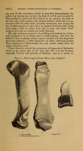 Keywords: The Quarterly journal of the Geological Society of London (12684156535).jpg 1852 <br> BROWN UPPER TERTIARIES AT COPFORD <br> 187 <br> ern part of this excavation which is somewhat basin-shaped the <br> yellow clay laminae vary in their dip from S to S E and to nearly E <br> This laminated yellow and blue clay is in my opinion the same as <br> the blue clay of the eastern and western sections which latter is co- <br> extensive with the other beds hereafter mentioned that occupy the <br> site of what appears to have been an ancient freshwater lake being <br> more than a mile in extent from east to west and about three- <br> quarters of a mile in a north and south direction <br> The clay undergoes a process of puddling and washing in a horse- <br> mill preparatory to its being used in brick-making ; and from the <br> debris of these washings various organic remains and rock-fragments <br> have been obtained rolled fragments of chalk rolled and angular <br> flints fragments of Kimmeridge clay and minute fossils from the <br> upper secondary rocks <br> I have formerly noticed the occurrence of fragments of freshwater <br> shells in the upper part of the blue clay No 4 of the Section <br> especially Valval a and opercula of Bithinia ; and on a recent re- <br> Fig 2 Metacarpal of large Bear from Copford <br> a Upper surface <br> b Proximal articular surface <br> c Lateral view 35461193 109911 51125 Page 187 Text v 8 http //www biodiversitylibrary org/page/35461193 1852 Geological Society of London NameFound Bithinia NameConfirmed Bithinia NameBankID 4091121 Biodiversity Heritage Library The Quarterly journal of the Geological Society of London v 8 1852 Geology Periodicals Smithsonian Libraries bhl page 35461193 dc identifier http //biodiversitylibrary org/page/35461193 smithsonian libraries Information field Flickr posted date ISOdate 2014-02-21 Check categories 2015 August 26 CC-BY-2 0 BioDivLibrary https //flickr com/photos/61021753 N02/12684156535 2015-08-27 11 50 58 cc-by-2 0 PD-old-70-1923 The Quarterly journal of the Geological Society of London 1852 Photos uploaded from Flickr by FĂŚ using a script |