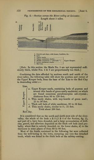 | Keywords: The Quarterly journal of the Geological Society of London (12683255975).jpg 372 <br> PROCEEDINGS OF THE GEOLOGICAL SOCIETY June 4 <br> Fig 2 Section across the River-valley at Leicester <br> Length about 5 miles <br> N <br> ts a <br> p ; <br> a <br> i '3 <br> 7 Gravels and clays with bones boulders c <br> 6 Lias <br> 5 Upper marls <br> 4 Upper sandstone-shales <br> 3 Middle sandstone soft beds J Upper Keuper <br> 2 Lower sandstone-shales <br> 1 Red clay <br> i <br> Note In this section the Marls No 5 are not represented suffi- <br> ciently thick whilst Nos 4 6 are proportionally too thick <br> Combining the data afforded by sections south and north of the <br> river-valley the following table will show the position and extent of <br> the Upper Keuper beds from the base of the Lias to the Red Clay <br> in descending order <br> Lias <br> a <br> Upper Keuper marls containing beds of gypsum and <br> several thin bands of green marly sandstone on which <br> are found numerous pseudomorphic salt-crystals ; <br> thickness from 80 to 120 feet <br> b Thin sandy shales with way-boards of green marl ; <br> 25 to 30 feet <br> c Thick soft beds of white sandstone 20 to 30 feet <br> d Thin sandy shales similar to 5 ; 35 feet <br> Total about 200 feet <br> Red clay <br> It is considered that on the north and north-west side of the river- <br> valley the whole of the beds « 5 5 4 of the Section fig 2 <br> and part of c have been denuded and a large accumulation of drift- <br> clay gravel and alluvium deposited on the thick soft beds and pro- <br> bably where that is entirely denuded on the lower shales d to the <br> thickness in some places of from 60 to 80 feet <br> Most of the fossils contained in the following list were collected <br> from the well-boring in the town excepting one very fine detached <br> tooth which was found in the thick beds at the railway -cutting 35338827 109655 51125 Page 372 Text v 12 http //www biodiversitylibrary org/page/35338827 1856 Geological Society of London Biodiversity Heritage Library The Quarterly journal of the Geological Society of London v 12 1856 Geology Periodicals Smithsonian Libraries bhl page 35338827 dc identifier http //biodiversitylibrary org/page/35338827 smithsonian libraries Information field Flickr posted date ISOdate 2014-02-21 Check categories 2015 August 26 CC-BY-2 0 BioDivLibrary https //flickr com/photos/61021753 N02/12683255975 2015-08-27 11 57 18 cc-by-2 0 PD-old-70-1923 The Quarterly journal of the Geological Society of London 1856 Photos uploaded from Flickr by FÊ using a script |
