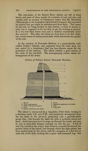 Keywords: The Quarterly journal of the Geological Society of London (12683215835).jpg 284 <br> PROCEEDINGS OF THE GEOLOGICAL SOCIETY April 9 <br> The coal- shales of the Hunter River district are full of fossil <br> leaves and some of them consist of a mixture of coal and clay and <br> contam such an amount of hituminous matter that Mr Beaumont <br> Mineralogist to the Australian Agricultural Company has expressed <br> an opinion that gas might be manufactured from them Two seams <br> of coal only are being worked in this district ; a third is known to <br> exist but is supposed to be too thin to pay for working at present <br> It is two feet thick where seen and is situated considerably below <br> the sea-level The other two seams are from four to six feet thick <br> but contain seams of carbonaceous shale which deteriorate the quality <br> of the coal <br> At the entrance of Newcastle Harbour is a perpendicular rock <br> called Nobby' s Island once separated from the main land but <br> now united by a breakwater that has been thrown across for the <br> protection of the harbour The island exhibits a good section of <br> the rocks of the coal-field The accompanying section shows the <br> arrangement of the strata <br> Section of Nobby s Island Newcastle Harbour <br> 1 Mould <br> 2 Trap-conglomerate <br> 3 Shales with plant-remains <br> 4 Coal <br> 5 Earthy sandstones and shales <br> 6 Chert <br> 7 Imperfect sandstones and shales <br> 8 Coal <br> 9 Trap-dyke <br> The island is intersected by a trap-dyke 9 feet thick running in <br> a direction nearly S E and N W and completely decomposed from <br> the top down to the sea-level presenting only a greenish-white <br> greasy clay ; but beneath the water the dyke is perfectly sound and <br> hard ; about low-water-level it crops up through the beach and may <br> be seen at some little distance running out into the sea A bed of <br> coal the second in the series that formerly extended far beyond the <br> present limits of the island and through which the dyke passes has <br> been washed away by the waves with the exception of a few feet on <br> each side of the dyke looking like a great half-consumed log ; this 35338737 109655 51125 Page 284 Text v 12 http //www biodiversitylibrary org/page/35338737 1856 Geological Society of London NameFound Shales Biodiversity Heritage Library The Quarterly journal of the Geological Society of London v 12 1856 Geology Periodicals Smithsonian Libraries bhl page 35338737 dc identifier http //biodiversitylibrary org/page/35338737 smithsonian libraries Information field Flickr posted date ISOdate 2014-02-21 Check categories 2015 August 26 CC-BY-2 0 BioDivLibrary https //flickr com/photos/61021753 N02/12683215835 2015-08-27 11 59 01 cc-by-2 0 PD-old-70-1923 The Quarterly journal of the Geological Society of London 1856 Photos uploaded from Flickr by Fæ using a script |