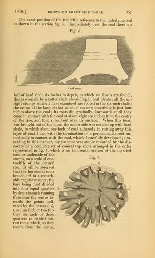 | Keywords: The Quarterly journal of the Geological Society of London (12645333963).jpg 1849 <br> BROWN ON ERECT SIGILLARI <br> 357 <br> The exact position of the tree with reference to the underlying coal <br> is shown in the section fig 6 Immediately over the coal there is a <br> Fig 6 <br> Coal seam <br> bed of hard shale six inches in depth in which no fossils are found ; <br> this is overlaid by a softer shale abounding in coal plants ; all the up- <br> right stumps which I have examined are rooted in the six-inch shale ; <br> the crown of the base of that which I am now describing is just four <br> inches above the coal ; its roots dip gradually downwards until they <br> come in contact with the coal at about eighteen inches from the centre <br> of the tree and then spread out over its surface When this fossil <br> was brought out of the mine the under side was covered up with hard <br> shale to which about one inch of coal adhered ; in cutting away this <br> layer of coal I met vdth the termination of a perpendicular root im- <br> mediately in contact with the coal which I carefully developed ; pro- <br> ceeding in this manner my patience was amply rewarded by the dis- <br> covery of a complete set of conical tap roots arranged in the order <br> represented in fig 7 which is an horizontal section of the inverted <br> base or underside of the <br> stump on a scale of one- <br> twelfth of the natural <br> size It will be observed <br> that the horizontal roots <br> branch off in a remark- <br> ably regular manner the <br> base being first divided <br> into four equal quarters <br> by deep channels running <br> from near the centre to- <br> wards the points indi- <br> cated by the letters i k <br> I m; an inch or two fur- <br> ther on each of these <br> quarters is divided into <br> two roots which as they <br> recede from the centre 35269007 109512 51125 Page 357 Text v 5 http //www biodiversitylibrary org/page/35269007 1849 Geological Society of London Biodiversity Heritage Library The Quarterly journal of the Geological Society of London v 5 1849 Geology Periodicals Smithsonian Libraries bhl page 35269007 dc identifier http //biodiversitylibrary org/page/35269007 smithsonian libraries Information field Flickr posted date ISOdate 2014-02-20 Check categories 2015 August 26 CC-BY-2 0 BioDivLibrary https //flickr com/photos/61021753 N02/12645333963 2015-08-27 10 57 57 cc-by-2 0 PD-old-70-1923 The Quarterly journal of the Geological Society of London 1849 Photos uploaded from Flickr by Fæ using a script |