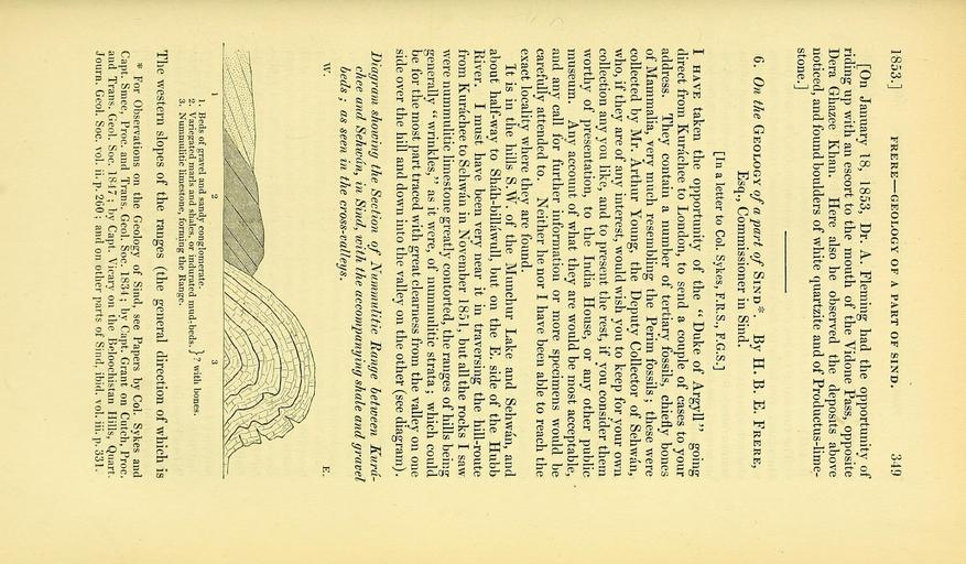 | Keywords: The Quarterly journal of the Geological Society of London (12512113463).jpg 1853 FRERE GEOLOGY OF A PART OF SIND 349 <br> On January 18 1853 Dr A Fleming had the opportunity of <br> riding up with an escort to the mouth of the Vidone Pass opposite <br> Dera Ghazee Khan Here also he observed the deposits above <br> noticed and found boulders of white quartzite and of Productus-lime- <br> stone <br> 6 On the Geology of a part of Sind By H B E Frere <br> Esq Commissioner in Sind <br> In a letter to Col Sykes F R S F G S <br> I HAVE taken the opportunity of the Duke of Argyll going <br> direct from Kurachee to London to send a couple of cases to your <br> address They contain a number of tertiary fossils chiefly bones <br> of Mammalia very much resembling the Perim fossils ; these were <br> collected by Mr Arthur Young the Deputy Collector of Sehwan <br> who if they are of any interest would wish you to keep for your own <br> collection any you like and to present the rest if you consider them <br> worthy of presentation to the India House or any other public <br> museum Any account of what they are would be most acceptable <br> and any call for further information or more specimens would be <br> carefully attended to Neither he nor I have been able to reach the <br> exact locality where they are found <br> It is in the hills S W of the Munch ur Lake and Sehwan and <br> about half-way to Shah-billawull but on the E side of the Hubb <br> River I must have been very near it in traversing the hill-route <br> from Kurachee to Sehwan in November 1851 but all the rocks I saw <br> Avere nummulitic limestone greatly contorted the ranges of hills being <br> generally wrinkles as it were of nummulitic strata; which could <br> be for the most part traced with great clearness from the valley on one <br> side over the hill and down into the valley on the other see diagram <br> Diagram showing the Section of Nummulitic Range between Kura- <br> chee and Sehwan i7i Sind with the accompanying shale and gravel <br> beds ; as seen in the cross-valleys <br> \v e <br> 1 Beds of gravel and sandy conglomerate \ ˘ i - <br> 2 Variegated marls and shales or indurated mudrbeds J ' ' <br> 3 Nummulitic limestone forming the Range <br> The western slopes of the ranges the general direction of which is <br> For Observations on the Geology of Sind see Papers by Col Sykes and <br> Capt Smee Proc and Trans Geol Soc 18 34 ; by Capt Grant on Ciitch Proc <br> and Trans Geol Soc 1S47 ; by Capt Vjcary on the Beloochistan Hills Quart <br> Journ Geol Soc vol ii p 260 ; and on other parts of Sind ibid vol iii p 331 34983482 108767 51125 Page 349 Text v 9 http //www biodiversitylibrary org/page/34983482 1853 Geological Society of London NameFound Dera NameConfirmed Dera NameBankID 4139169 NameFound Mammalia NameConfirmed Mammalia EOLID 15503955 NameBankID 2478620 Biodiversity Heritage Library The Quarterly journal of the Geological Society of London v 9 1853 Geology Periodicals Smithsonian Libraries bhl page 34983482 dc identifier http //biodiversitylibrary org/page/34983482 smithsonian libraries Information field Flickr posted date ISOdate 2014-02-14 Check categories 2015 August 26 CC-BY-2 0 BioDivLibrary https //flickr com/photos/61021753 N02/12512113463 2015-08-27 09 51 44 cc-by-2 0 PD-old-70-1923 The Quarterly journal of the Geological Society of London 1853 Photos uploaded from Flickr by FĂŚ using a script |