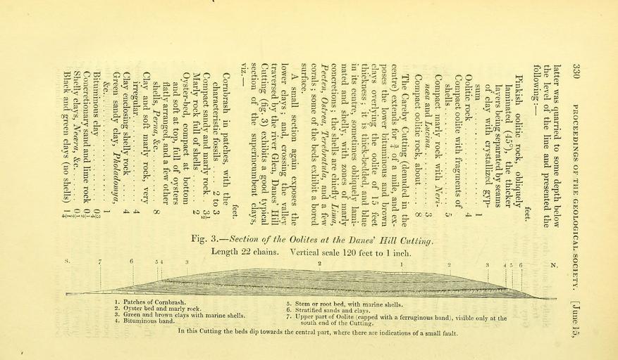 | Keywords: The Quarterly journal of the Geological Society of London (12512100673).jpg 330 <br> PROCEEDINGS OF THE GEOLOGICAL SOCIETY June 15 <br> latter was quarried to some depth below <br> the level of the Ime and presented the <br> following ” <br> feet <br> Pinkish oolitic rock obliquely <br> laminated 45° the thicker <br> layers being separated by seams <br> of clay with crystallized gyp- <br> sum 1 <br> Oolitic rock 4 <br> Compact oolite with fragments of <br> shells 5 <br> Compact marly rock with Neri- <br> ncBu and Lucina 3 <br> Compact oolitic rock about 8 <br> The Careby Cutting denuded in the <br> centre extends for f of a mile and ex- <br> poses the lower bituminous and brown <br> clays overlying the oolite of 15 feet <br> thickness ; it is thick-bedded and blue <br> ia its centre sometimes obliquely lami- <br> nated and shelly with zones of marly <br> concretions ; the shells are chiefly Lima <br> Pecten Ostrea Terehratula and a few <br> corals ; some of the beds exhibit a bored <br> surface <br> A small section again exposes the <br> lower clays ; and crossing the valley <br> traversed by the river Glen Danes' Hill <br> Cutting fig 3 exhibits a good typical <br> section of the superincumbent clays <br> viz ” <br> feet <br> Cornbrash in patches with the <br> characteristic fossils 2 to 3 <br> Compact sandy and marly rock 3 <br> Marly rock full of shells' 2 <br> Oyster-bed compact at bottom <br> and soft at top full of oysters <br> flatly arranged and a few other <br> shells Perna c 8 <br> Clay and soft marly rock very <br> irregular 4 <br> Clay enclosing shelly rock 4 <br> Green sandy clay Pholadomya <br> c 1 <br> Bituminous clay Of <br> Concretionary sand and lime rock 0-i- <br> Shelly clays Necera c 0\ <br> Black and green clays no shells J <br> 5i <br> s -3 <br> CO H <br> K J2 O – <br> S £ -T - c <br> 3 u 2 o 34983461 108767 51125 Page 330 Text v 9 http //www biodiversitylibrary org/page/34983461 1853 Geological Society of London NameFound Lucina NameConfirmed Lucina EOLID 10720506 NameBankID 4935025 NameFound Ostrea NameConfirmed Ostrea EOLID 10719983 NameBankID 2692450 NameFound Pecten NameConfirmed Pecten EOLID 10719936 NameBankID 2692292 NameFound Perna NameConfirmed Perna EOLID 59522 NameBankID 4935024 NameFound Pholadomya NameConfirmed Pholadomya EOLID 4744545 NameBankID 4294325 Biodiversity Heritage Library The Quarterly journal of the Geological Society of London v 9 1853 Geology Periodicals Smithsonian Libraries bhl page 34983461 dc identifier http //biodiversitylibrary org/page/34983461 smithsonian libraries Information field Flickr posted date ISOdate 2014-02-14 Check categories 2015 August 26 CC-BY-2 0 BioDivLibrary https //flickr com/photos/61021753 N02/12512100673 2015-08-27 09 55 24 cc-by-2 0 PD-old-70-1923 The Quarterly journal of the Geological Society of London 1853 Photos uploaded from Flickr by Fæ using a script |
