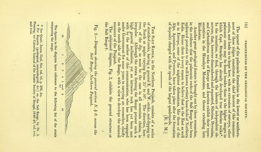 | Keywords: The Quarterly journal of the Geological Society of London (12511888795).jpg 192 PROCEEDINGS OF THE GEOLOGICAL SOCIETY <br> The upcast of the palaeozoic formations in the lowest or southern- <br> most of these ridges constitutes the chief interest of this communi- <br> catiouj and leads us to hope how with an extension of surveys other <br> palaeozoic zones may be found besides those in the higher ranges in <br> which Capt Strachey has already developed true Silurian rocks <br> In the meantime we find through the labours of independent ob- <br> servers that however dismembered and separated Silurian Devonian <br> and Carboniferous rocks of Europe and America exhibit their repre- <br> sentatives in the Himalaya Mountains and thence extending into <br> Hindostan <br> Another great geological feature is brought out by these researches <br> in the evidence that the palaeozoic rocks of the Salt Range have been <br> upheaved posterior to the well-known tertiary bone-beds of Northern <br> India Hence there is every reason to believe that in the East as well <br> as in Europe some of the mightiest dislocations like those of the <br> Alps Apennines and Pyrenees have taken place after the formation <br> of deposits charged with the spoils of the largest quadrupeds <br> R I M <br> The Salt Range in the Northern Punjaub consists of a series <br> of stratified rocks having a general E and W strike and dipping to <br> the North at angles varying from 35° to 50° The direction how- <br> ever of the dip as must be the case in all mountain chains is <br> irregular Although the strata forming the Range present such a <br> high general inclination yet no intrusive rock has yet been met <br> with by the author of this commimication who has been engaged <br> under Government for some years in carrying on researches chiefly <br> on the south side of the Range with a view to develope the mineral <br> resources of the Punjaub <br> The subjoined diagram Fig 2 exhibits the general structure ot <br> the Salt Range f <br> Fig 2 ” Diagram showing the general section N ' S across the <br> Salt Rarcge Northern Punjaub <br> The figures in tlie diagram have reference to the following list of the strata <br> composing the range <br> See Quart Journ Geol Soc vol vii p 292 c <br> t For Reports geological mineralogical c on the Salt Range by Dr A <br> Fleming see Calcutta Journal of the Asiatic Society of Bengal 1848-49 vol xvii <br> and xviii 34983305 108767 51125 Page 192 Text v 9 http //www biodiversitylibrary org/page/34983305 1853 Geological Society of London NameFound Himalaya NameConfirmed Himalaya NameBankID 4552760 Biodiversity Heritage Library The Quarterly journal of the Geological Society of London v 9 1853 Geology Periodicals Smithsonian Libraries bhl page 34983305 dc identifier http //biodiversitylibrary org/page/34983305 smithsonian libraries Information field Flickr posted date ISOdate 2014-02-14 Check categories 2015 August 26 CC-BY-2 0 BioDivLibrary https //flickr com/photos/61021753 N02/12511888795 2015-08-27 10 02 03 cc-by-2 0 PD-old-70-1923 The Quarterly journal of the Geological Society of London 1853 Photos uploaded from Flickr by Fæ using a script |