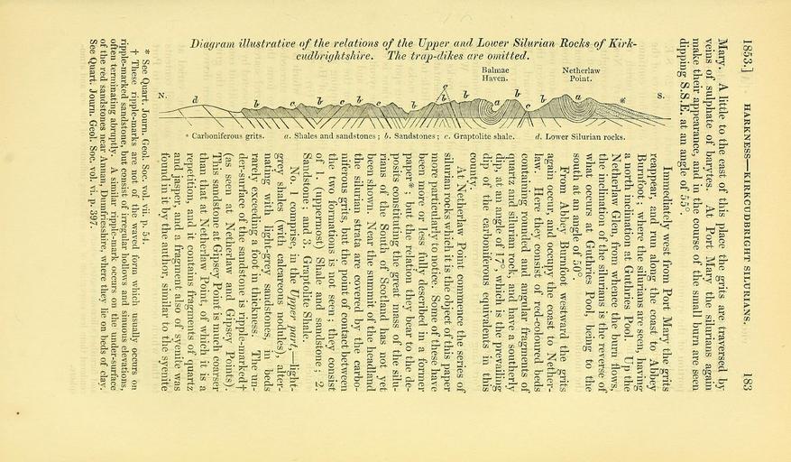 | Keywords: The Quarterly journal of the Geological Society of London (12512005023).jpg 1853 <br> HARKNESS KIRKCUDBRIGHT SILURIANS <br> 183 <br> 2 li <br> 3 <br> Mary A little to the east of this place the grits are traversed by <br> veins of sulphate of barytes At Port Mary the Silurians again <br> make their appearance and in the course of the small burn are seen <br> dipping S S E at an angle of 55° <br> Immediately west from Port Mary the grits <br> reappeai' and run along the coast to Abbey <br> Burnfoot ; where the silurians are seen having <br> a north inclination at Guthries Pool Up the <br> Netherlaw Glen from whence the burn flows <br> the inclination of the silurians is the reverse of <br> what occurs at Guthries Pool being to the <br> south at an angle of 50° <br> ' £ From Abbey Burnfoot westward the grits <br> again occur and occupy the coast to Nether- <br> law Here they consist of red-coloured beds <br> containing rounded and angular fragments of <br> quartz and silurian rock and have a southerly <br> dip at an angle of 1 7° which is the prevailing <br> dip of the carboniferous equivalents in this <br> county <br> At Netherlaw Point commence the series of <br> silurian rocks which it is the object of this paper <br> more particularly to notice Some of these have <br> been more or less fully described in a former <br> paper ; but the relation they bear to the de- <br> posits constituting the great mass of the silu- <br> rians of the South of Scotland has not yet <br> been shown Near the summit of the headland <br> the silurian strata are covered by the carbo- <br> niferous grits but the point of contact between <br> the two formations is not seen ; they consist <br> of 1 uppermost Shale and sandstone; 2 <br> Vl Sandstone; and 3 Graptolite Shale <br> No 1 comprise in the Upper part ” light- <br> grey shales with calcareous nodules alter- <br> nating with light-grey sandstones in beds <br> rarely exceeding a foot in thickness The un- <br> der-surface of the sandstone is ripple-markedf <br> as seen at Netherlaw and Gipsey Points <br> This sandstone at Gipsey Point is much coarser <br> than that at Netherlaw Point of which it is a <br> repetition and it contains fragments of quartz <br> and jasper and a fragment also of syenite was <br> found in it by the author similar to the syenite <br> See Quart Joum Geol Soc vol vii p 54 <br> t These ripple-marks are not of the waved form which usually occurs on <br> ripple-marked sandstone but consist of irregular hollows and sinuous elevations <br> often terminating abruptly A similar ripple-mark occurs on the under-surface <br> of the red sandstones near Annan Dumfriesshire where they lie on beds of day <br> See Quart Joum Geol Soc vol vi p 397 <br> 5 <br> y i 34983296 108767 51125 Page 183 Text v 9 http //www biodiversitylibrary org/page/34983296 1853 Geological Society of London Biodiversity Heritage Library The Quarterly journal of the Geological Society of London v 9 1853 Geology Periodicals Smithsonian Libraries bhl page 34983296 dc identifier http //biodiversitylibrary org/page/34983296 smithsonian libraries Information field Flickr posted date ISOdate 2014-02-14 Check categories 2015 August 26 CC-BY-2 0 BioDivLibrary https //flickr com/photos/61021753 N02/12512005023 2015-08-27 09 52 14 cc-by-2 0 PD-old-70-1923 The Quarterly journal of the Geological Society of London 1853 Photos uploaded from Flickr by Fæ using a script |